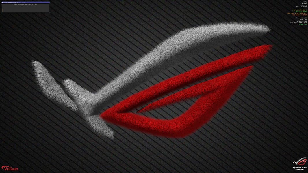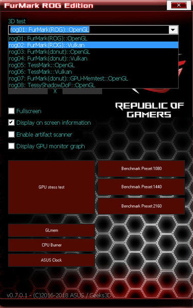 В качестве фирменного теста проверки на работоспособность карты (в выбранном режиме разгона) разработчики выпустили брендированный вариант FurMark (ROG Edition).