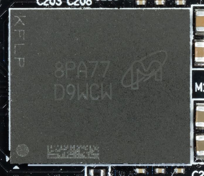 Карта имеет 8 ГБ памяти GDDR6 SDRAM, размещенной в 8 микросхемах по 8 Гбит на лицевой стороне PCB. Микросхемы памяти Micron (GDDR6) рассчитаны на номинальную частоту работы в 3500 (14000) МГц