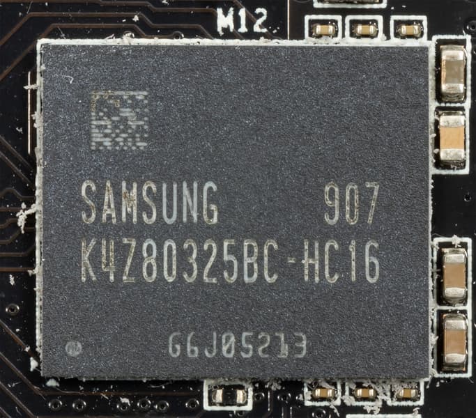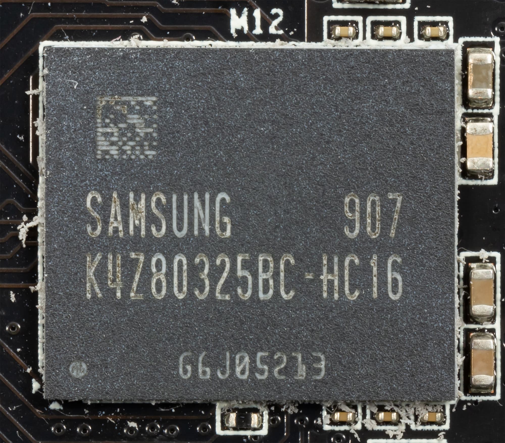 Карта имеет 8 ГБ памяти GDDR6 SDRAM, размещенной в 8 микросхемах по 8 Гбит на лицевой стороне PCB. Микросхемы памяти Samsung (GDDR6) рассчитаны на номинальную частоту работы в 4000 (16000) МГц