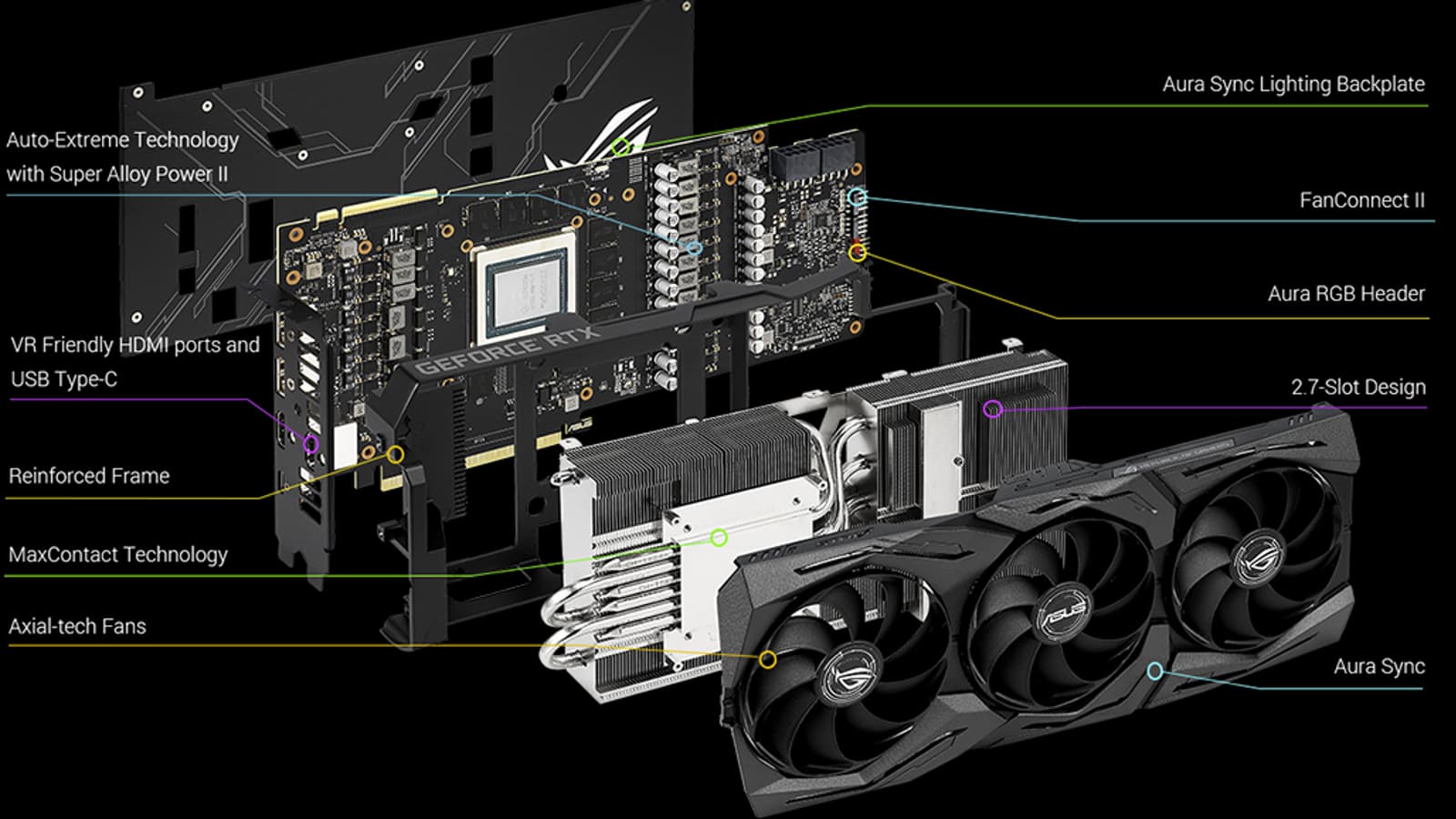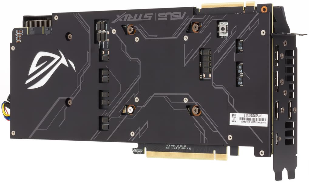 Традиционно для карт Asus серии Strix, печатная плата полностью разработана инженерами компании. PCB имеет разведенную шину обмена с памятью в 384 бит, то есть можно установить до 12 32-битных микросхем памяти суммарным объемом в 12 ГБ, просто одна микросхема не установлена, таким образом получен объем в 11 ГБ и шина обмена с памятью в 352 бит.