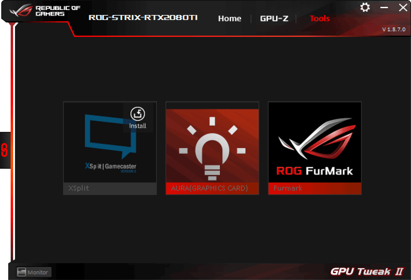 С помощью этой утилиты пользователь может не только выбрать один из предустановленных режимов с повышенными частотами работы карты, но и выставить частоту вручную, а также изменить напряжение на ядре и микросхемах памяти. Дополнительно можно управлять режимами подсветки кулера. А в качестве фирменного теста проверки на работоспособность карты (в выбранном режиме разгона) разработчики выпустили брендированный вариант FurMark (ROG Edition).