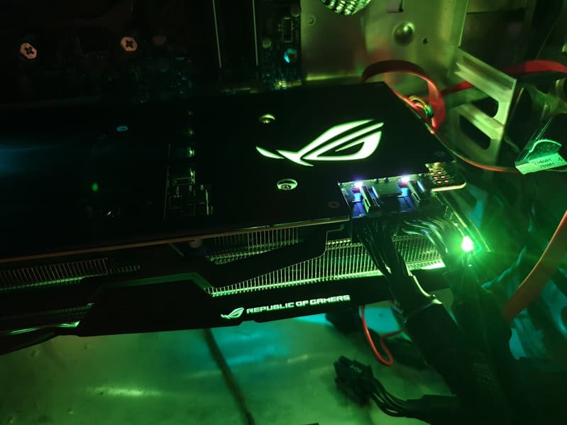 Силовые транзисторы охлаждаются вторым радиатором, а к микросхемам памяти прижата через термоинтерфейс рамка кулера, но тепло она практически не отводит. На обороте видеокарты установлена толстая пластина, которая обеспечивает жесткость относительно массивной видеокарты (предотвращая изгиб печатной платы), а также служит дополнительным радиатором для PCB (прижимаясь к ней через термоинтерфейс, который производитель называет самым эффективным). СО оснащена подсветкой, цветом которой можно управлять с помощью вышеупомянутой утилиты Asus GPU Tweak II.