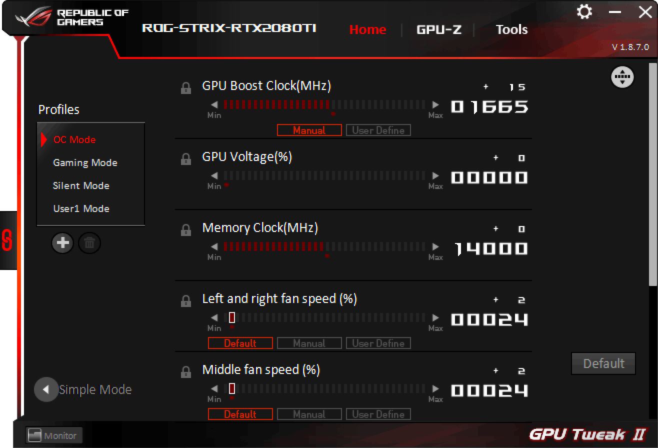 Управление работой карты обеспечивается с помощью фирменной утилиты Asus GPU Tweak II, которую можно скачать с сайта производителя.