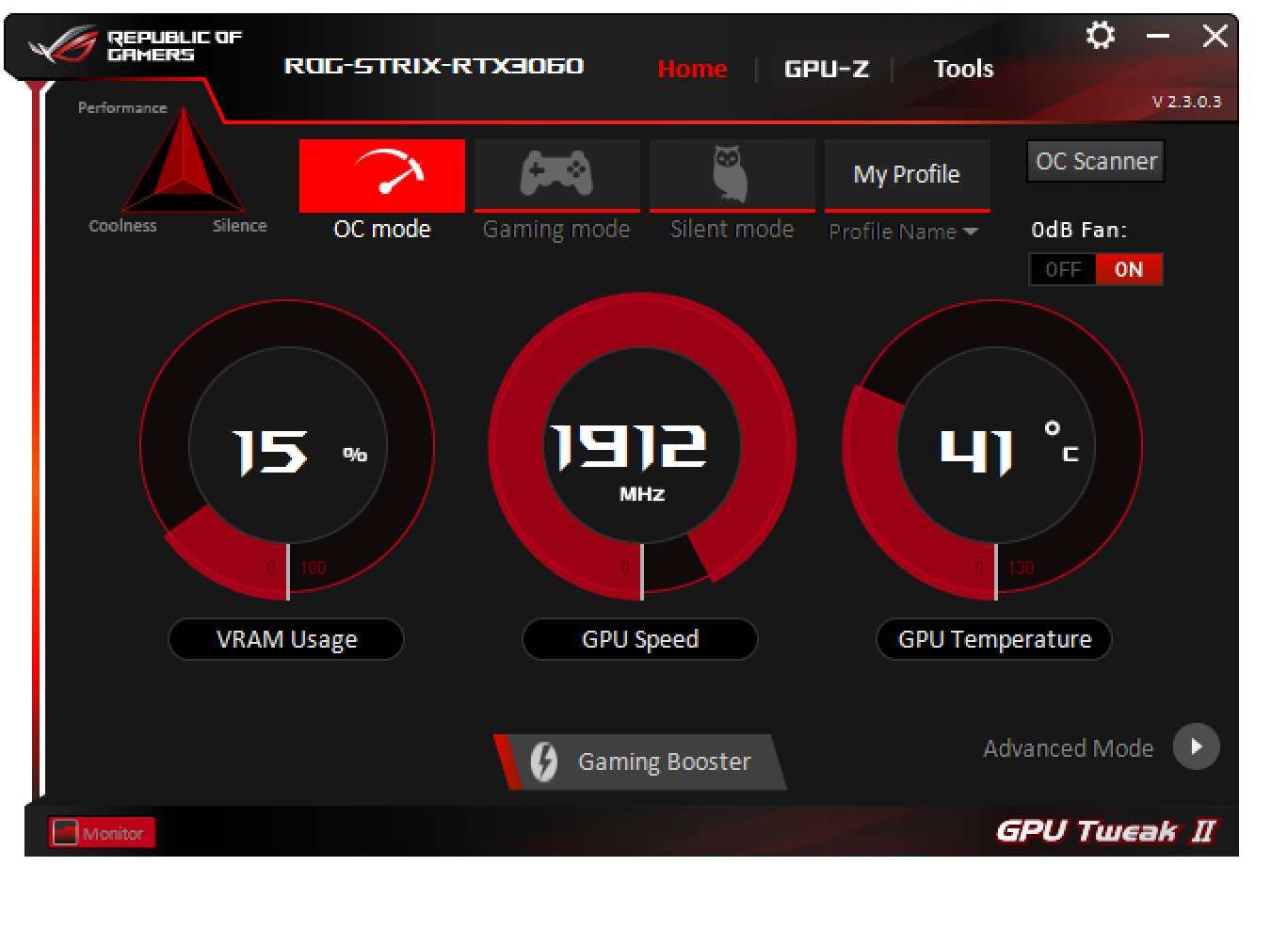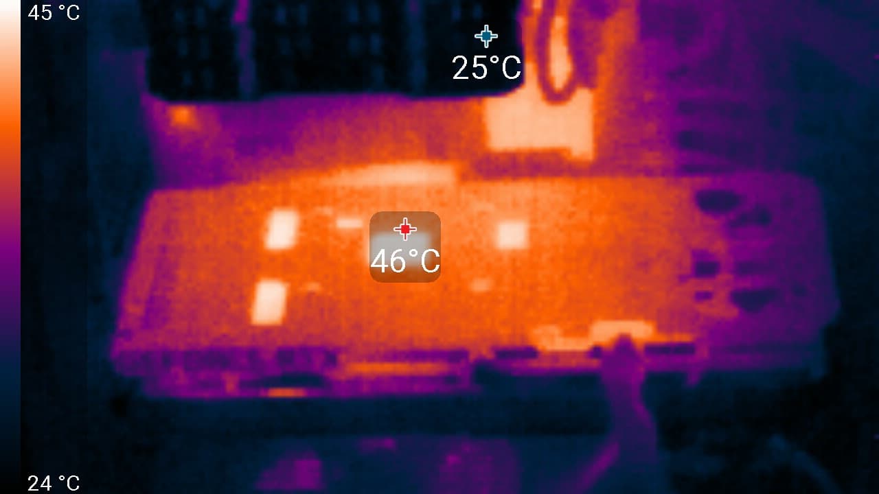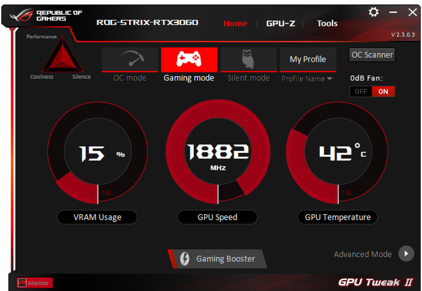 В простое режимы Performance Mode и Quiet Mode совершенно не отличались: в 2D температура была не выше 36 °C, вентиляторы не работали, уровень шума был равен фоновому — 18 дБА.