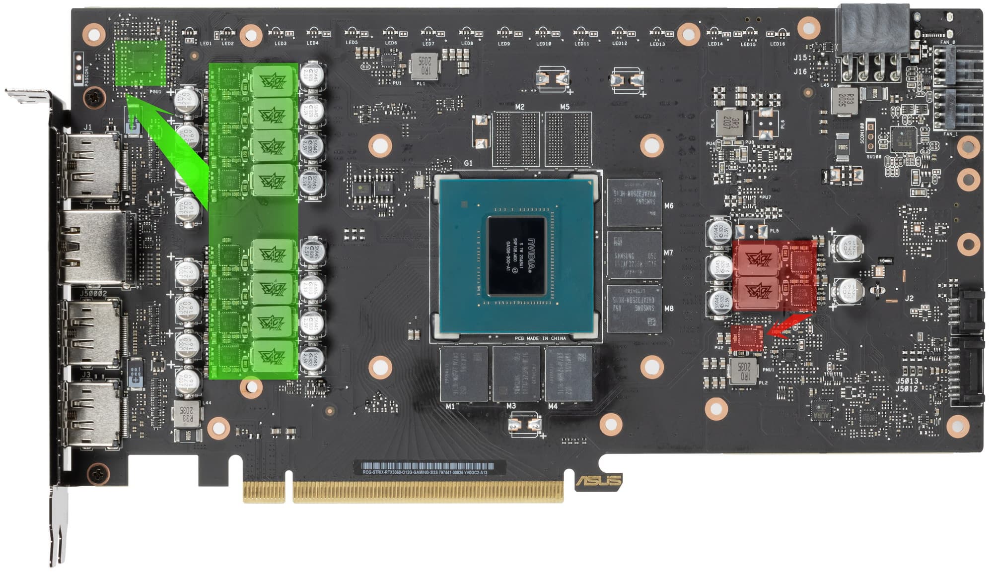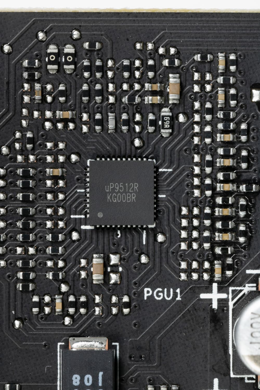 Зеленым цветом отмечена схема питания ядра, красным — памяти. Для управления схемой питания GPU используется ШИМ-контроллер uP9512R (uPI Semiconductor). Он расположен на лицевой стороне платы.