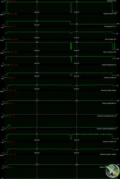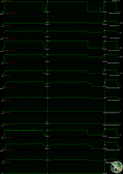 При описанном ручном разгоне параметры работы карты особо не менялись, однако максимальное потребление выросло до 167 Вт.