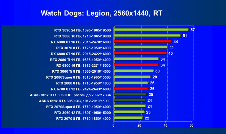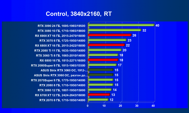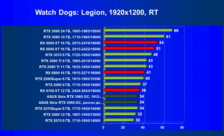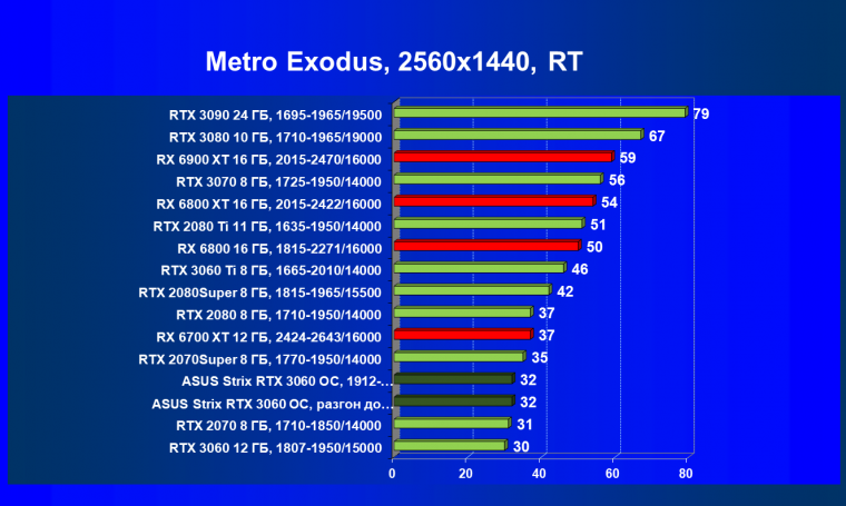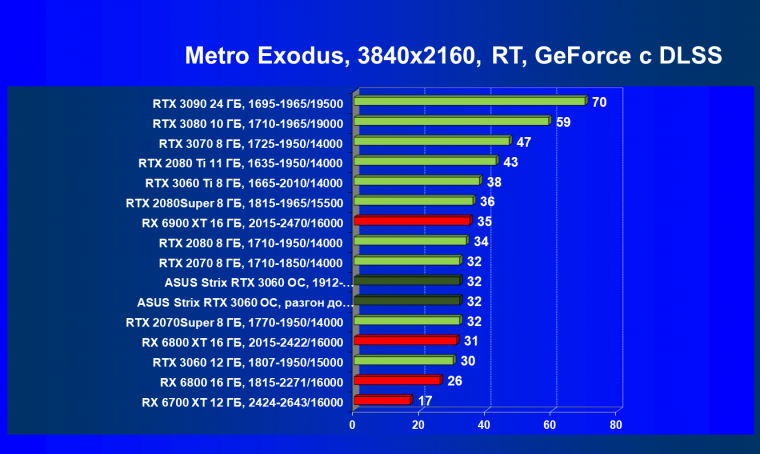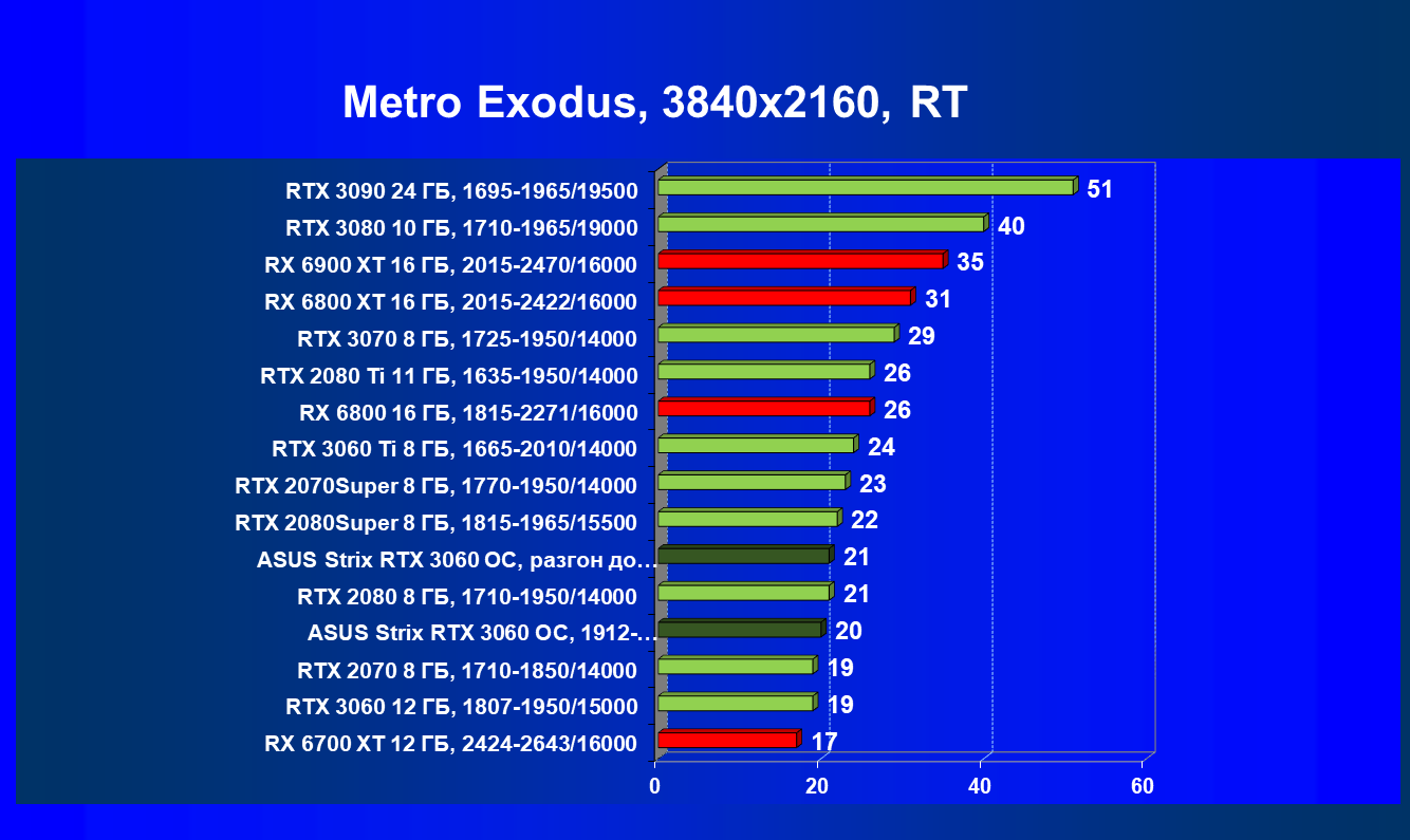 RTX 3060 обходит конкурентов в лице RTX 2070 и RX 5700 XT, при этом карта Asus за счет ручного разгона уже вплотную подходит к RTX 2070 Super.