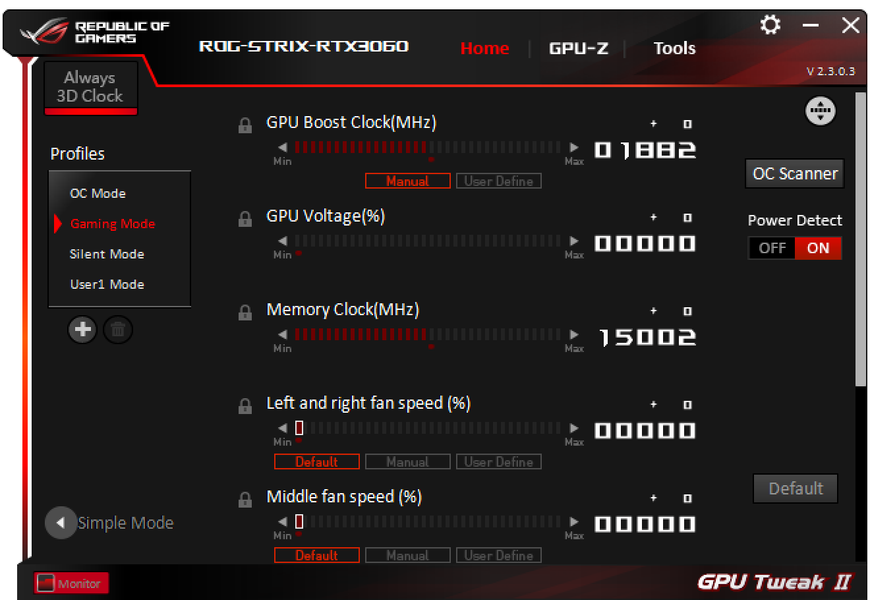 Через фирменную утилиту Asus GPU Tweak II можно включить фабричный режим OC Mode. Разумеется, есть и возможность ручного разгона.