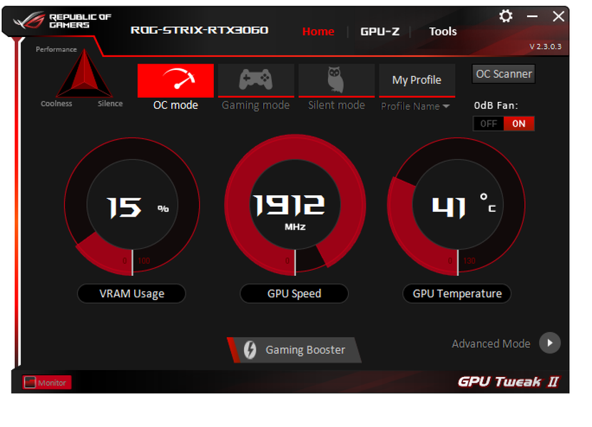 Штатная частота памяти у карты Asus равна референсному значению, а частота работы ядра в режиме по умолчанию (Gaming mode) на 4% выше в бусте, нежели у референс-карты. OC Mode поднимает Boost-частоту на 6% относительно референсной величины, однако максимальная частота выше референсного максимума лишь на 5,5%, поэтому суммарно прирост производительности оказался не больше 5%. При ручном разгоне потребление можно поднять до 123%. Карта стабильно работала при разгоне ядра до максимальных 2092 МГц, а памяти — до 17,3 ГГц. Это примерно на 8% выше референсных величин, и такой разгон обеспечил прирост производительности на 7,2%.