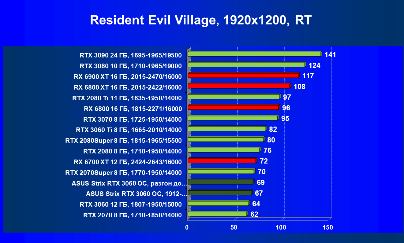 Напоминаем, что GeForce RTX 3060 имеет уровень производительности существенно ниже, чем у своего старшего собрата с суффиксом Ti: если RTX 3060 Ti отлично подходит для игры в разрешении 2.5К, и даже с RT(+DLSS) способен обеспечить приемлемый комфорт в играх в таком разрешении, то GeForce RTX 3060 полноценно подходит для игры с максимальными настройками (включая использование RT+DLSS) только в разрешении Full HD. Правда, в этом разрешении он, как правило, тянет игры даже с RT без DLSS), но на разрешение 2.5К замахнуться уже будет трудно. Конечно, найдутся такие игры, где и в разрешении 2560×1440 такая видеокарта обеспечит комфортный игровой процесс без снижения настроек графики, но это, скорее, будут сетевые игры с относительно примитивной графикой. Из стана AMD конкурентом является Radeon RX 5700 XT, который, понятное дело, соперничает только в играх без трассировки лучей. Видеокарта Asus в плане производительности побыстрее референс-аналога.