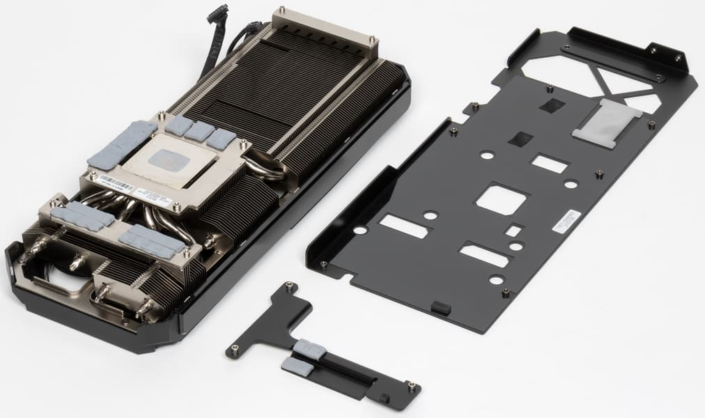 Основой СО является огромный пластинчатый никелированный радиатор с тепловыми трубками, припаянными к подошве прямого контакта с GPU и микросхемами памяти. Этот же радиатор служит охладителем и для компонентов преобразователей питания VRM с помощью небольших подошв. Для пары мосфетов VRM памяти предусмотрен отдельный маленький радиатор, прикручиваемый к основному радиатору. Задняя пластина выполнена из алюминия с электроизолирующим покрытием и имеет двойное предназначение: служит элементом защиты PCB и ребром жесткости.