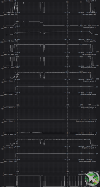В этом режиме нагрев ядра был немного выше — 72 °C, но вентиляторы вращались медленнее. Память максимально нагревалась до 86 °C, что для GDDR6X вполне приемлемо.
