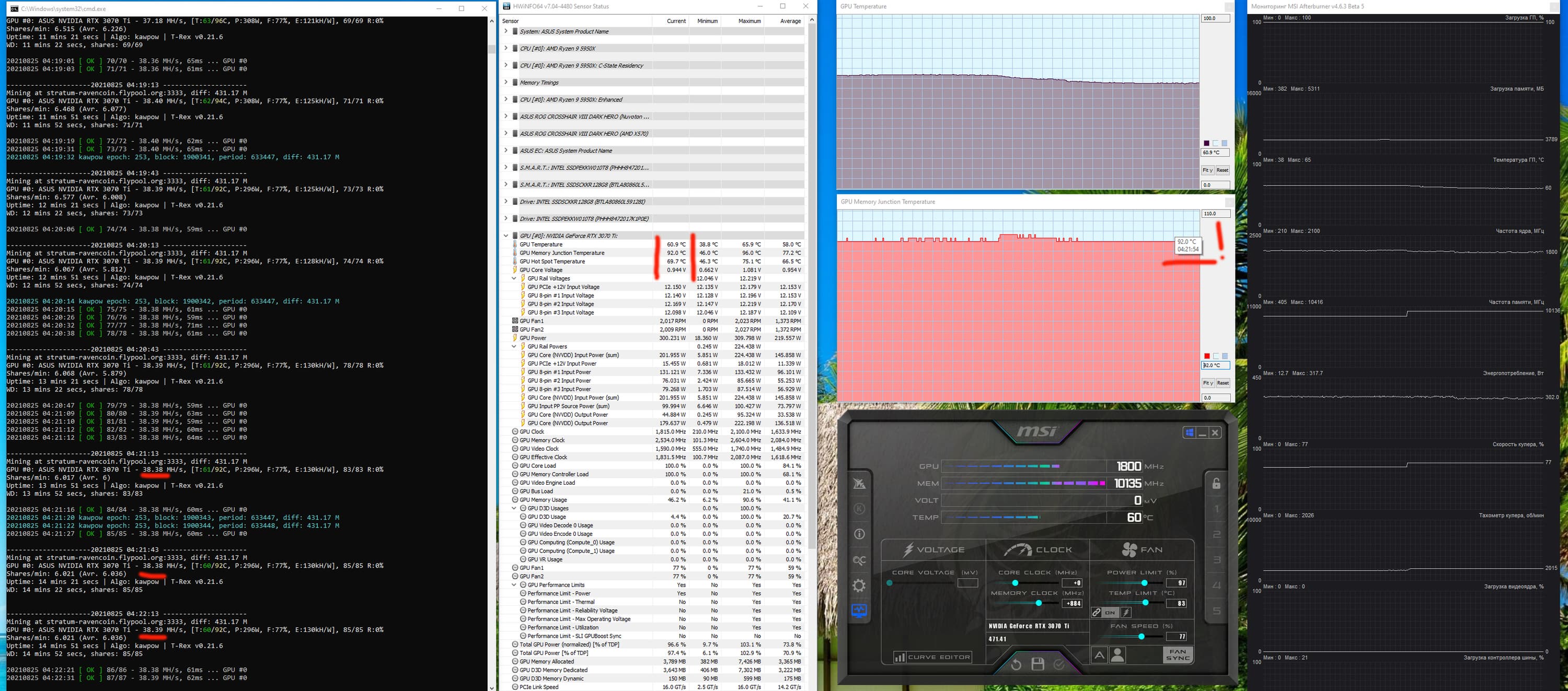 Оптимизация алгоритма kawpow (RVN) здесь мало чего дает, ибо сильное понижение PL приводит к падению хешрейта (а в случае с ethash сильно спасало именно снижение PL, ибо хешрейт оставался таким же при гораздо меньшем потреблении). Нагрев памяти чуть упал, делая данный вид майнинга приемлемым, но выгодно ли получать 38 МХ/с при потреблении 300 Вт — пользователь решит сам.