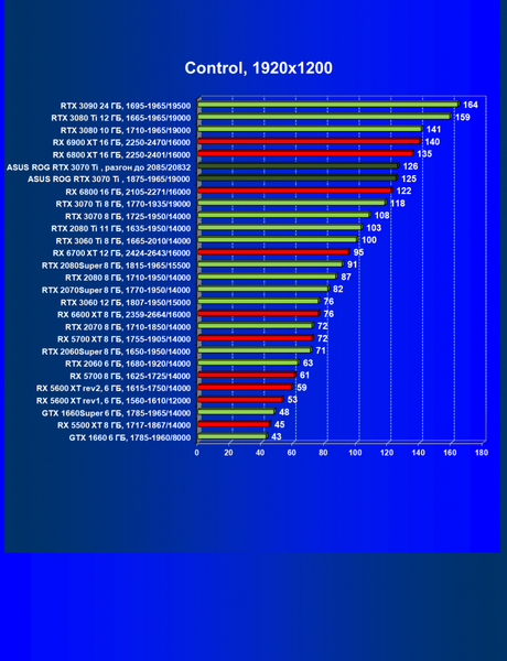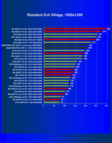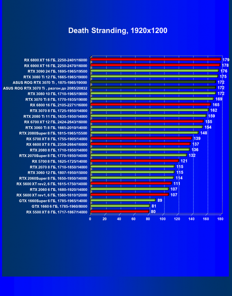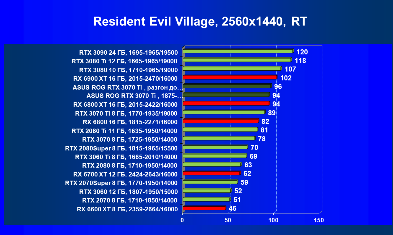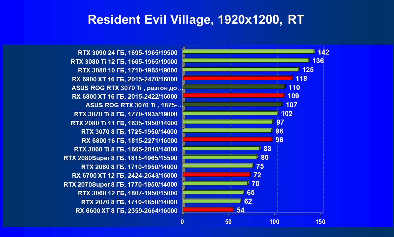 Здесь картина поменялась из-за того, что видеокарты AMD последнего поколения являются аутсайдерами вследствие чрезмерного падения производительности в играх с трассировкой лучей. И поэтому мы видим, что RTX 3070 Ti в лице референс-карты (не говоря уж о карте Asus) обходит не только прямого соперника RX 6800, но и более дорогого RX 6800 XT.