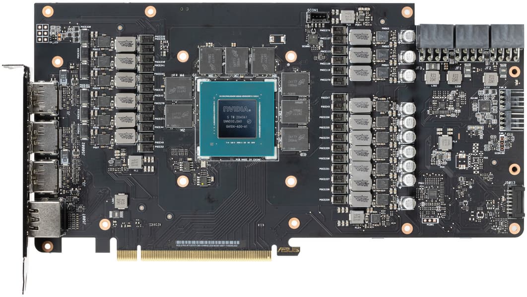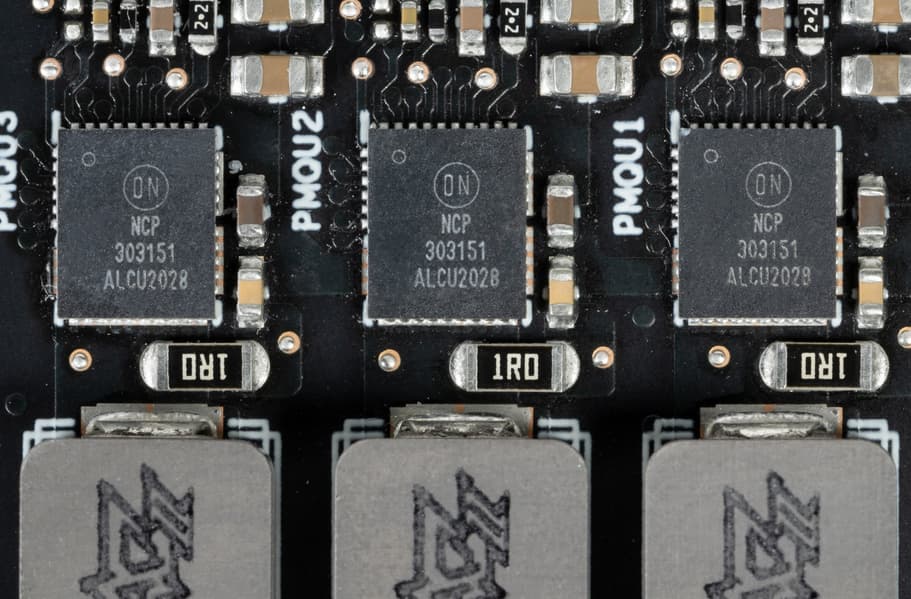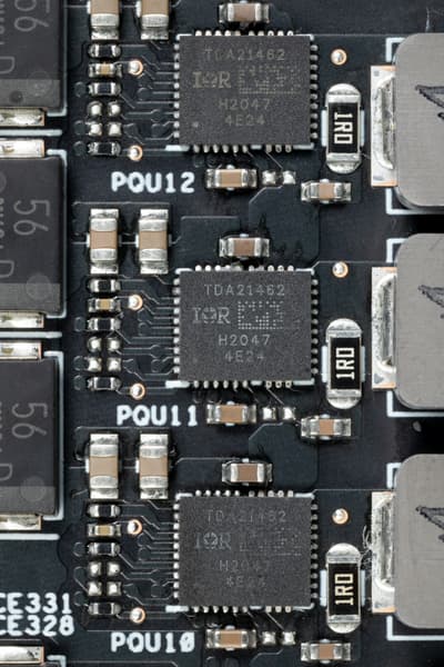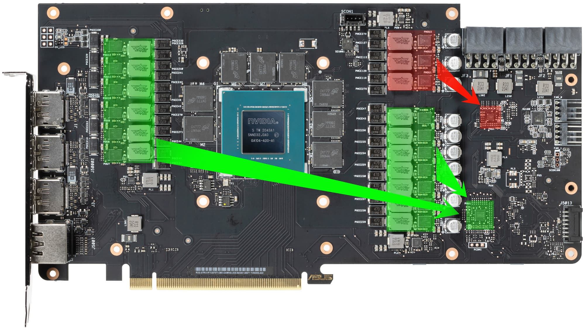 Суммарное количество фаз питания у Nvidia GeForce RTX 3070 Ti Founders Edition — 12: 9 фаз на ядро и 3 на микросхемы памяти. У карты Asus в сумме 16 фаз: 3 на память и 13 на GPU.