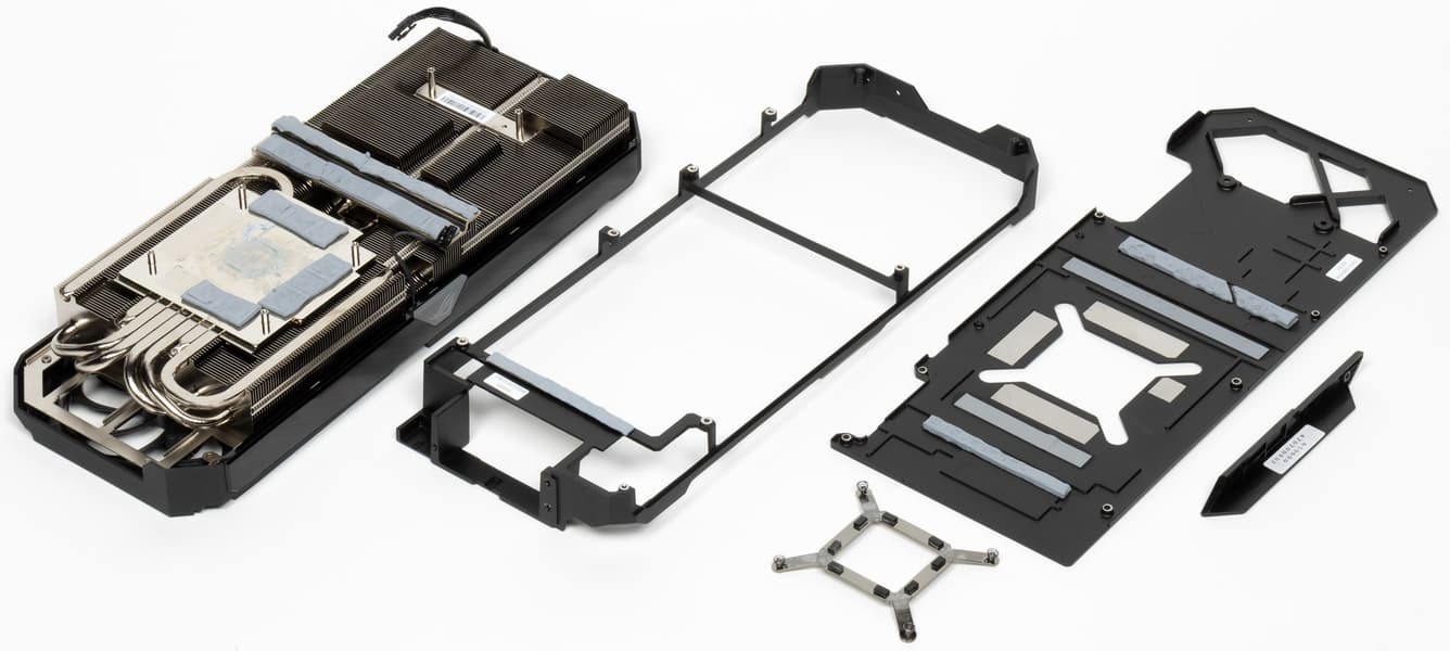 Основой СО является огромный двухсекционный пластинчатый никелированный радиатор с тепловыми трубками, припаянными к подошве прямого контакта с GPU и микросхемами памяти. Этот же радиатор служит охладителем и для компонентов преобразователей питания VRM с помощью небольших подошв. Для остальных мосфетов VRM предусмотрен отдельный радиатор, размещенный на раме, прикрученной к основному радиатору (эта рама также служит ребром жесткости всей карты, недопуская ее провисание после установки в системный блок). Задняя пластина выполнена из алюминия с электрозащитным покрытием и имеет двойное предназначение: служит элементом защиты PCB и через термоинтерфейс участвует в охлаждении PCB в районе микросхем памяти и преобразователей питания.