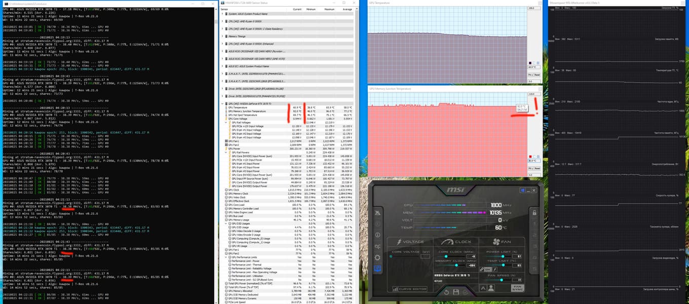 А вот хэшрейт по RVN ожидаемый (пропорциональный теоретическим возможностям ускорителя), так что в данном случае защита от майнинга не работает (также проверялось на альткоине ERGO). Соответственно, «защищена» карта, только пока основным алгоритмом майнинга остается ethash. Следует особо отметить, что алгоритм kawpow запрашивает более высокого энергопотребления, чем ethash. Поэтому нагрев выше, чем в предыдущем случае. 3070 Ti в майнинге RVN показал хешрейт между RX 6900 XT и RTX 3080. НО! Нагрев памяти карты сразу же при запуске майнинга достиг 94 градусов, что в принципе приемлемо, но все же является предметом особого внимания. Впрочем, не забываем, что это запуск по умолчанию. .
