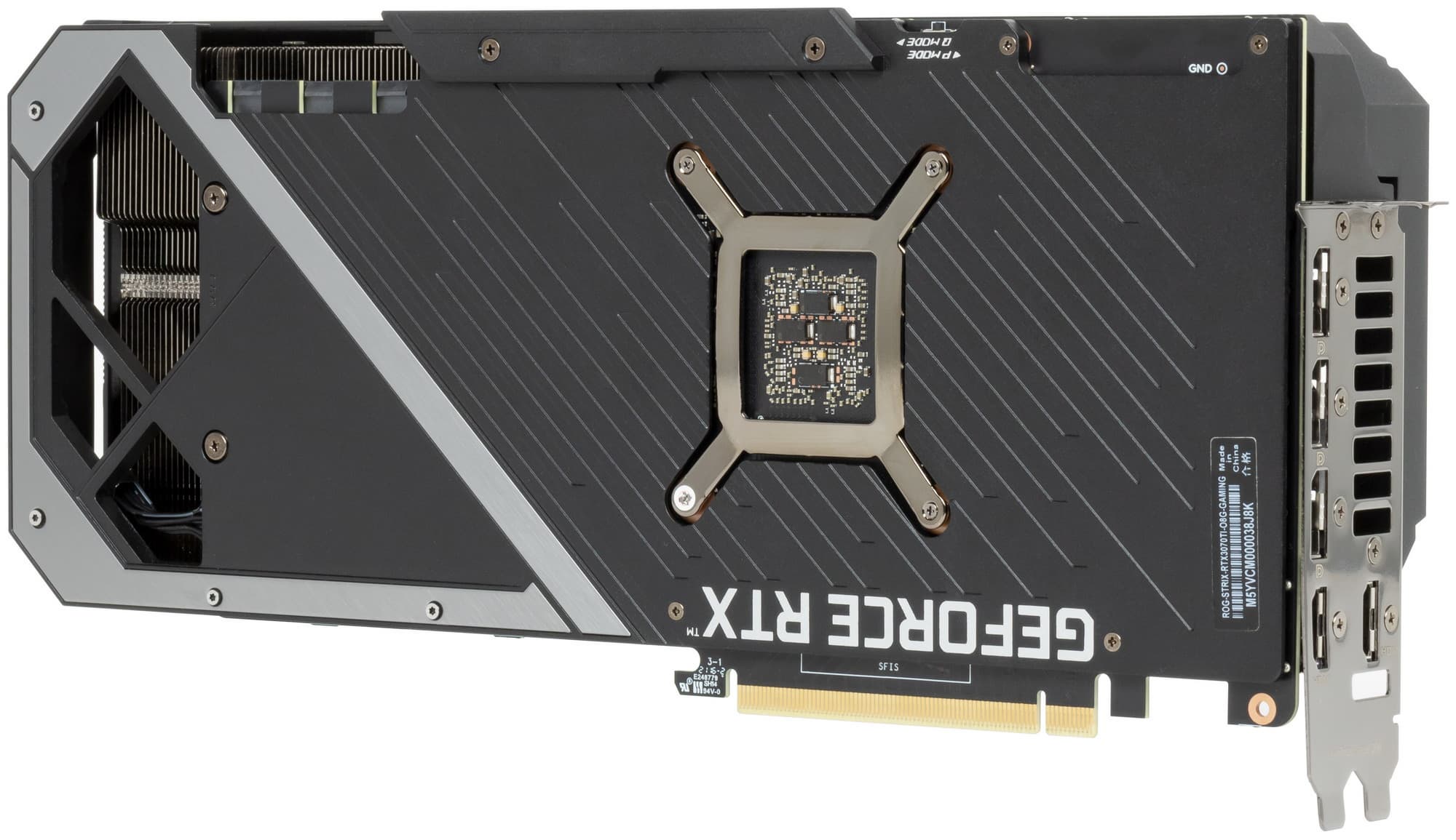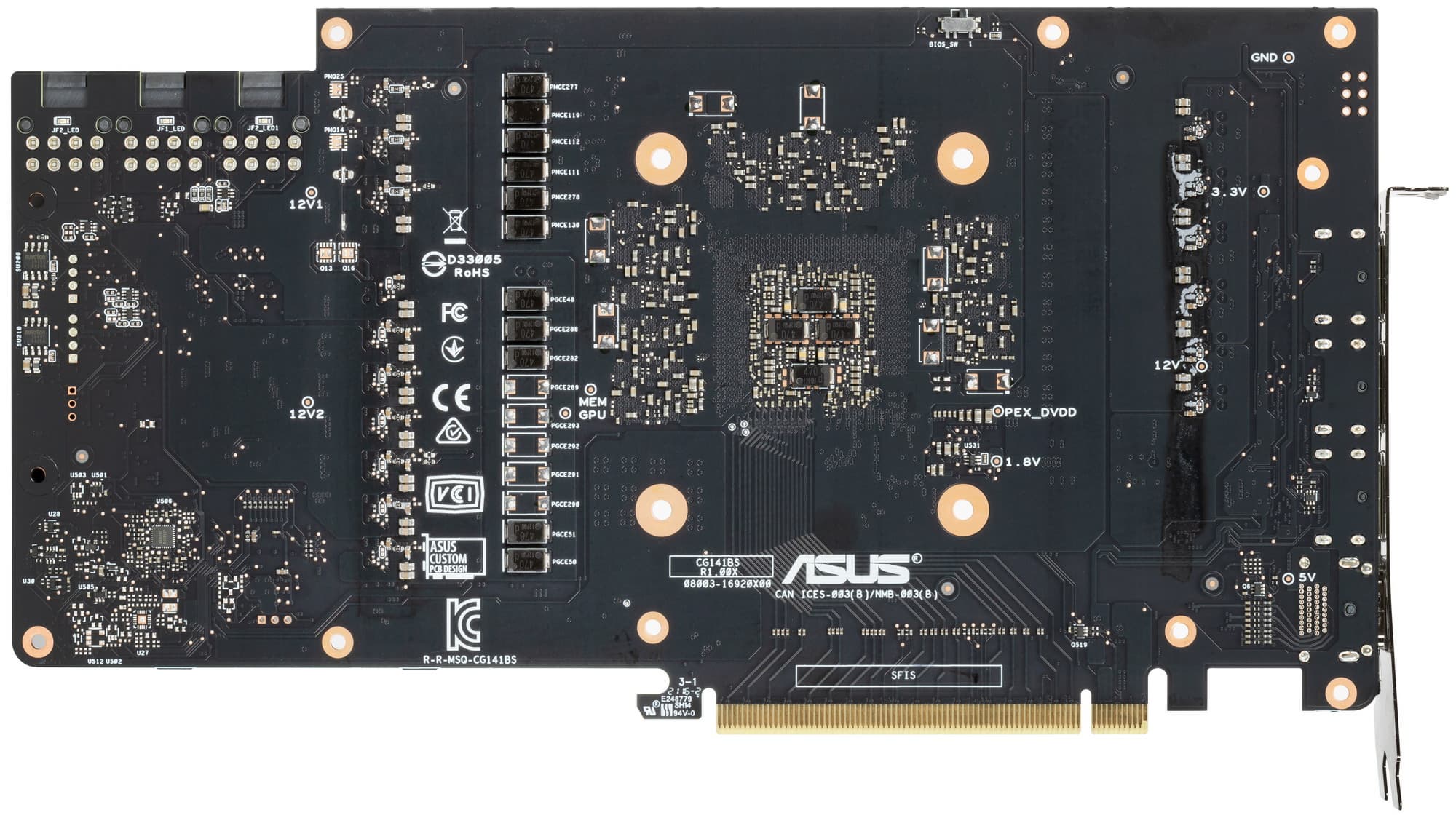 Новая концепция охлаждения, предложенная Nvidia, предусматривает наличие радиатора, который заметно длиннее самой PCB, при этом крайний правый вентилятор СО продувает ребра и тепловые трубки радиатора насквозь. Карта Asus почти полностью следует этой концепции, однако печатная плата у нее огромная, а следовательно вместе с СО эта карта будет смотреться настоящим монстром.