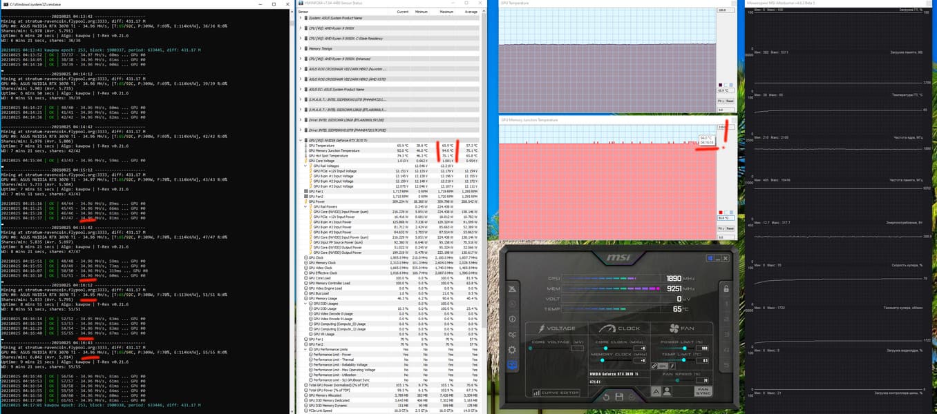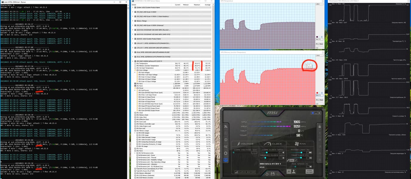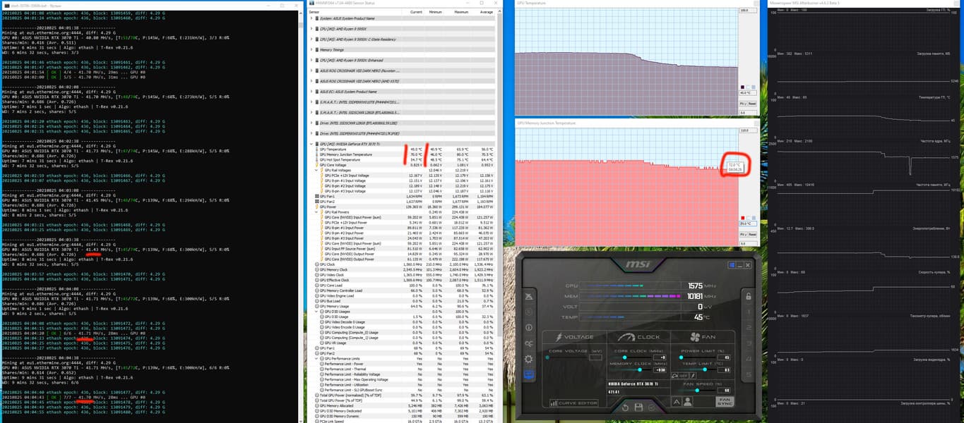 Оптимизация настроек работы видеокарт под майнинг в нашем случае не предусматривает сильного разгона видеопамяти, также обязательным является внешний обдув видеокарт. Особо тщательно надо следить за нагревом GDDR6X у GeForce RTX 3070Ti/3080/3080Ti/3090, ибо максимум для этой памяти — 110 градусов, и она долго не проживет, постоянно работая в условиях нагрева выше 100 °C. В нашем случае после оптимизации параметров работы карты и принудительного улучшения охлаждения нагрев памяти в майнинге по алгоритму ethash резко снизился до 70 — 72 градусов, так что в плане температурных показателей карта вполне годна для таких целей. Но все же не забываем, что выдает она низкий хешрейт — около 41 МХ/с, потребляя при этом весьма много — 138 Вт.