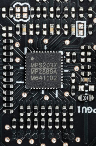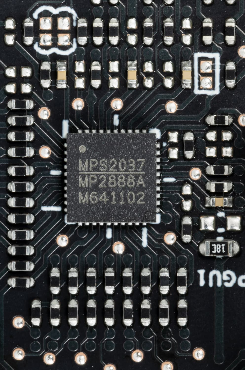 Зеленым цветом отмечена схема питания ядра, красным — памяти. Для управления схемой питания GPU используются два ШИМ-контроллера MP2888A (Monolithic Power Systems), рассчитанных максимально на 10 фаз каждый. Они расположены на лицевой стороне платы.