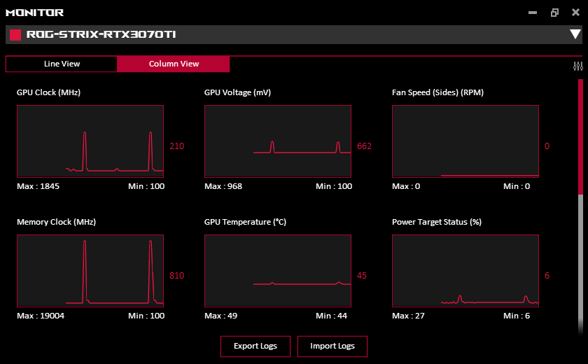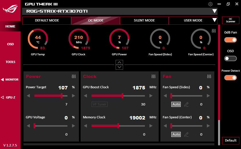 Штатная частота памяти у карты Asus равна референсному значению, а частота работы ядра в режиме по умолчанию (Gaming mode) выше в бусте, нежели у референс-карты на 5%. OC Mode поднимает частоту в Boost еще больше: на 6,2% относительно референсной величины. Суммарно прирост производительности оказался не выше 5%. При ручном разгоне потребление можно поднять до 125%, однако все равно драйверы ограничивали разгон. Карта стабильно работала при разгоне ядра до максимальных 2085 МГц, а память — на 20,8 ГГц. Такой разгон обеспечил прирост производительности примерно на 8% в разрешении 4К.