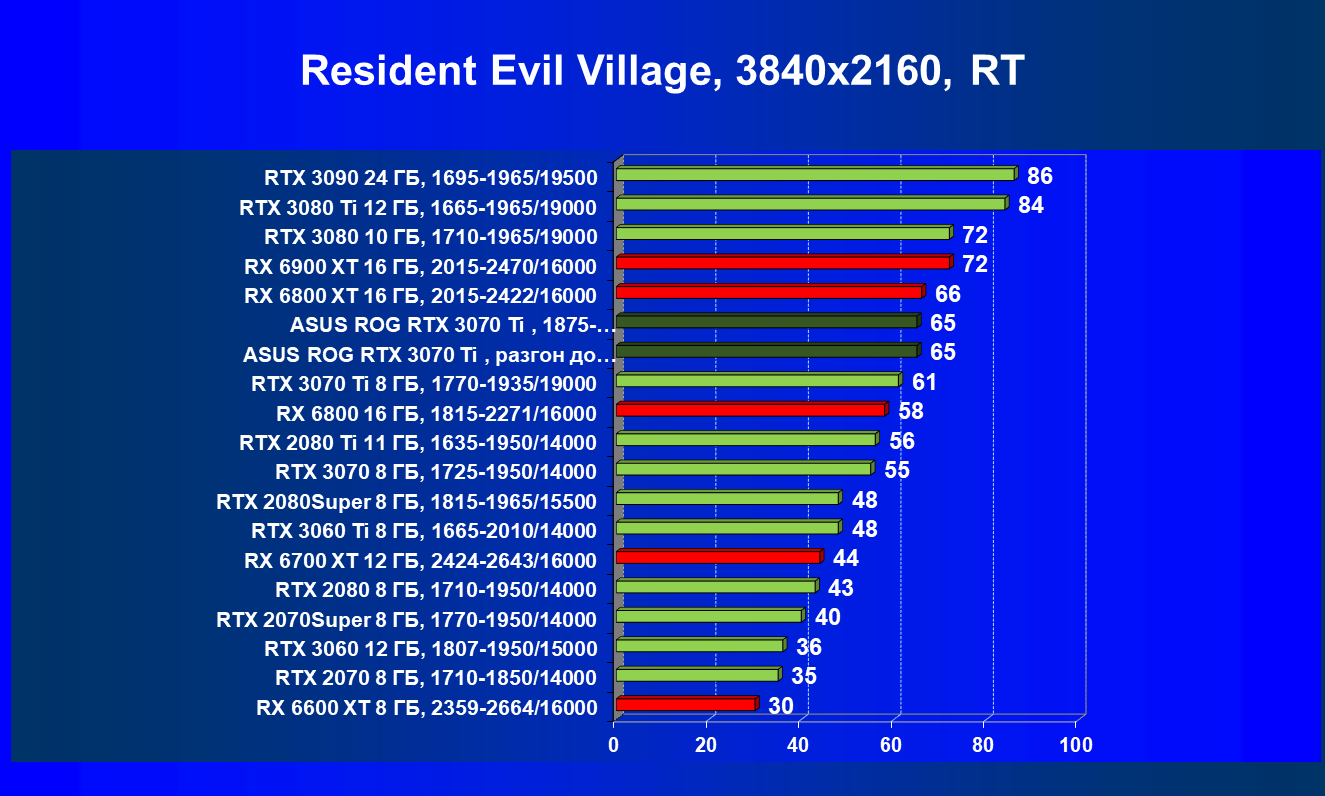 Так сложилось, что на сегодня у RTX 3070 Ti имеется единственный конкурент в лице Radeon RX 6800, который издавна (со времен RTX 3070) шел несколько выше по производительности, обладая сопоставимой с последним ценой. И вот мы видим, что и 3070 Ti не может догнать соперника, и даже неплохой разгон карты Asus позволил ей лишь догнать RX 6800.