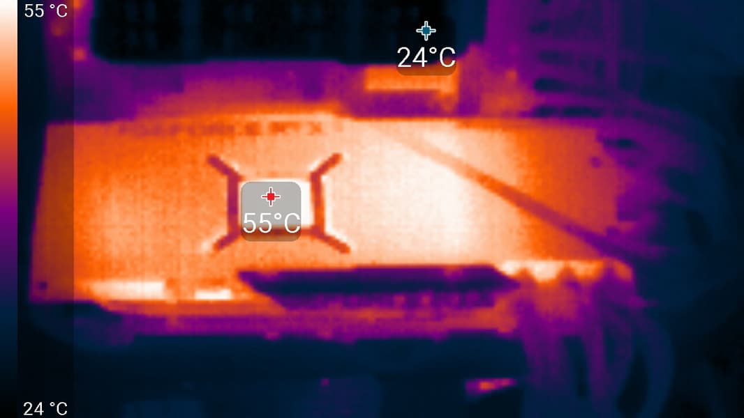 В режиме максимальной нагрузки в 3D температура в Performance Mode достигала 65 °C. Вентиляторы при этом раскручивались до 1670 оборотов в минуту, шум вырастал до 34,1 дБА: это отчетливо слышно, но терпимо. В видеоролике ниже шум фиксировался на пару секунд через каждые 30 секунд.