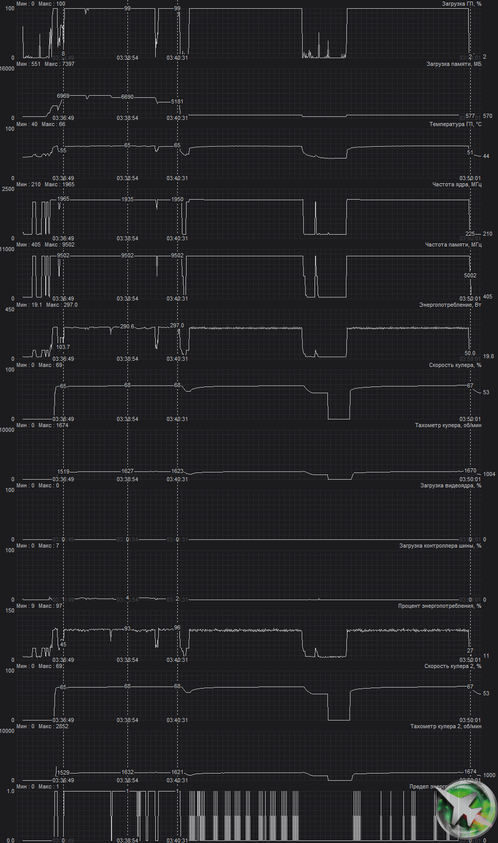 После 2-часового прогона под нагрузкой максимальная температура ядра не превысила 65 градусов, что является отличным результатом для видеокарт такого уровня. Нагрев микросхем памяти был не выше 80 °C.