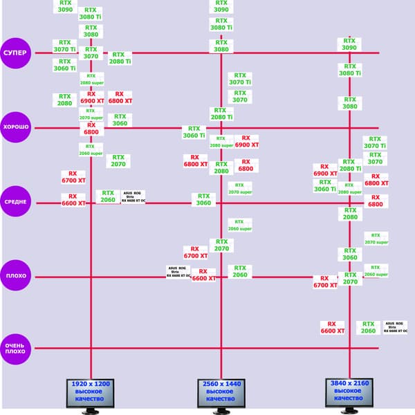 Наши тесты показали, что GeForce RTX 3070 Ti хорошо подходит для «классических» игр без использования трассировки лучей в разрешении 4К при условии максимального качества графики, правда в некоторых играх все же FPS будет низковат для 3840х2160, поэтому возможно придется перейти в 2.5К, где 3070 Ti — просто царь! Ближайший конкурент — Radeon RX 6800. Видеокарта Asus в плане производительности несколько пошустрее референс-аналога.