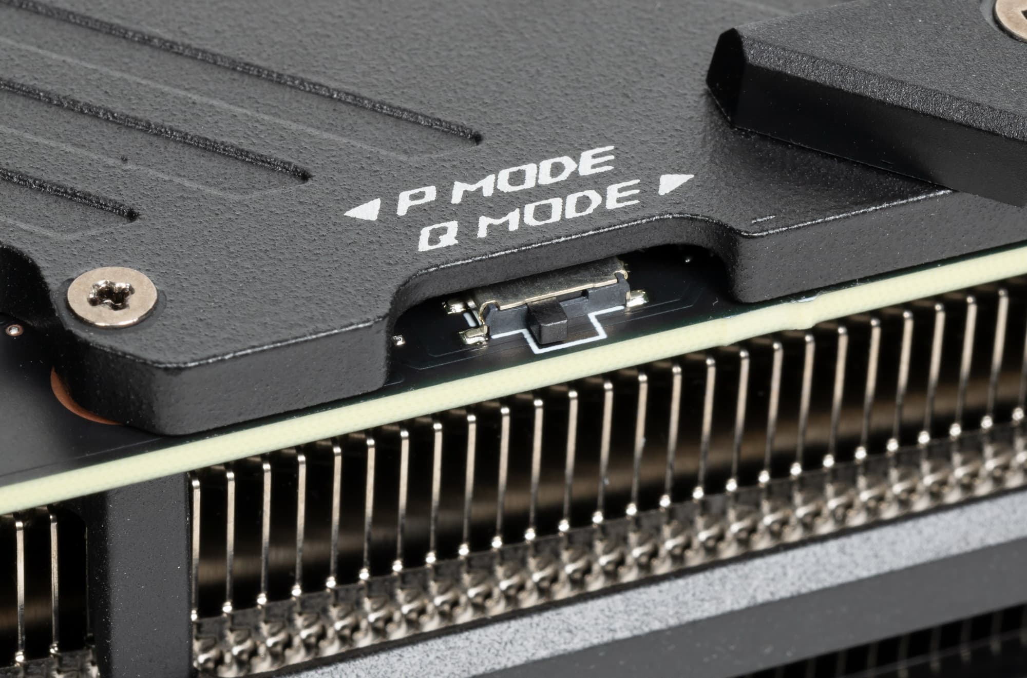 Карта имеет двойной BIOS, что уже традиционно для топовых решений Asus. На торце карты есть переключатель, в разных версиях BIOS (они названы Performance mode и Quiet mode — производительный и тихий режимы) заданы разные кривые работы вентиляторов.
