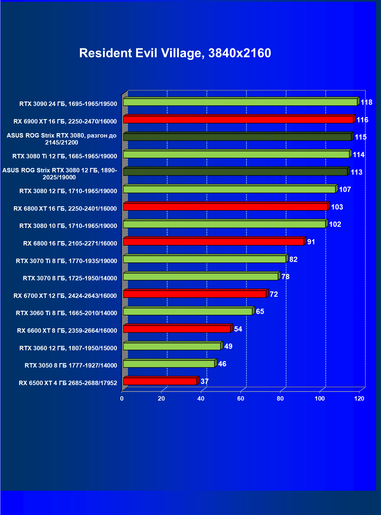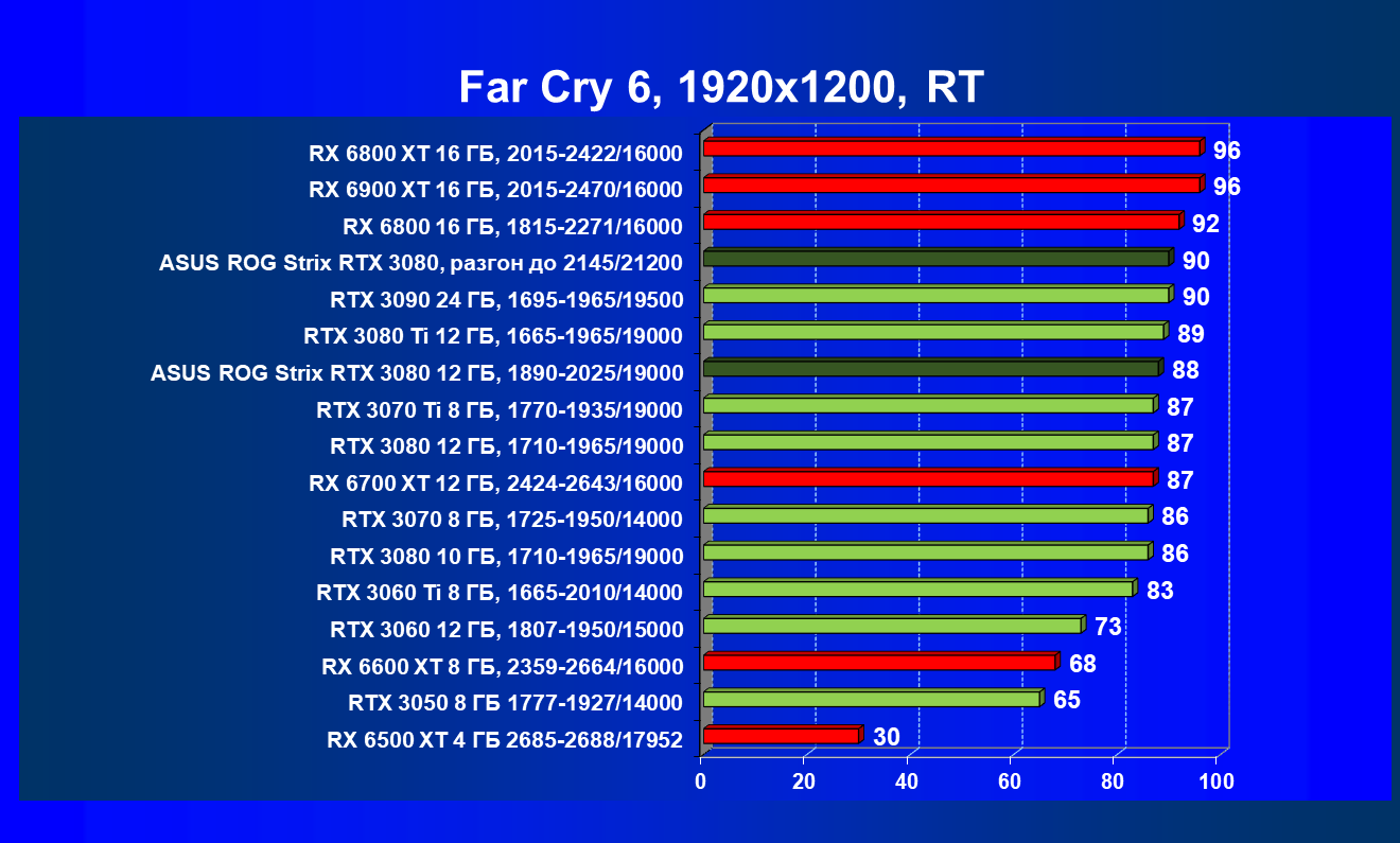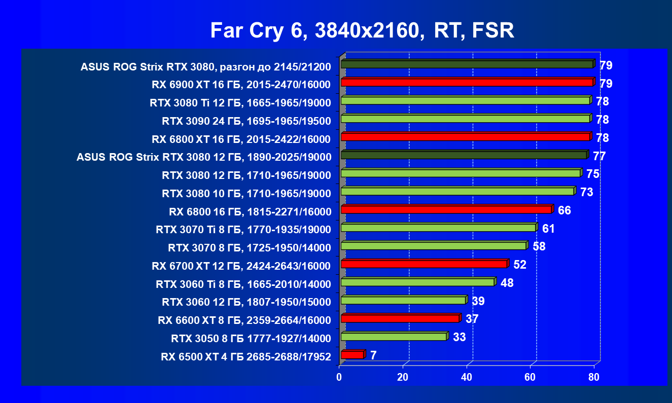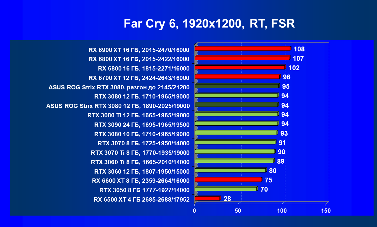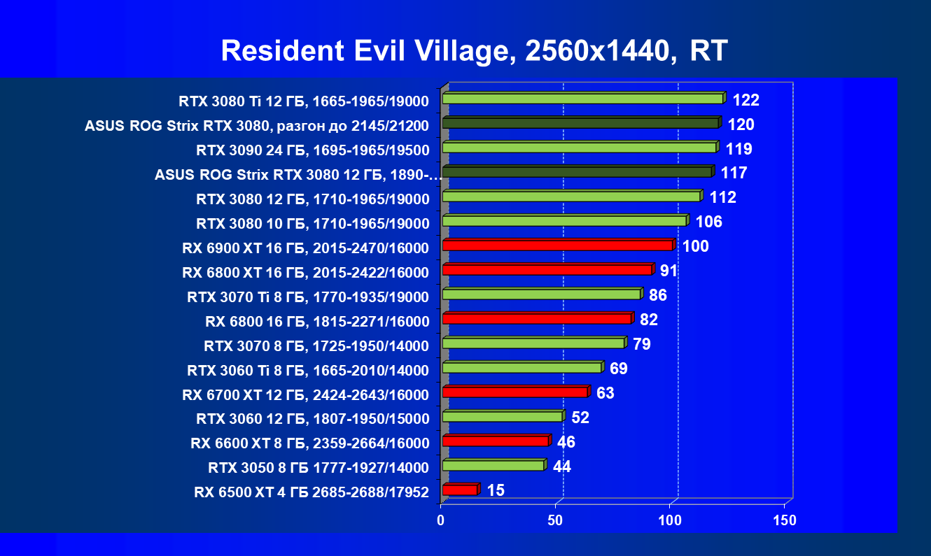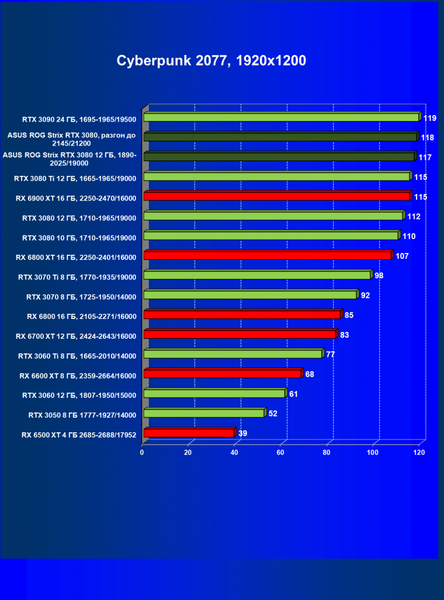 Radeon RX 6900 XT попал в нашу группу и возглавил данный рейтинг по классическим играм без трассировки лучей и дополнительных техник в виде DLSS/FSR. В таких играх RX 6800 XT опережает своего конкурента в лице RTX 3080 с 10 ГБ, и только новая версия RTX 3080 с 12 ГБ видеопамяти из-за чуть более производительного GPU и расширенной шины обмена с памятью идет с ним на равных. Ну а карта Asus из-за повышенных частот работы графического процессора обошла конкурента в лице RX 6800 XT и даже догнала RTX 3080 Ti. Разгон карты Asus почти не сказался на рейтинге, так как в Full HD эта карта и так не являлась узким местом.