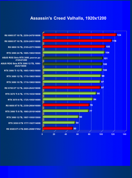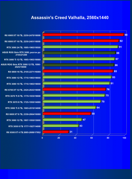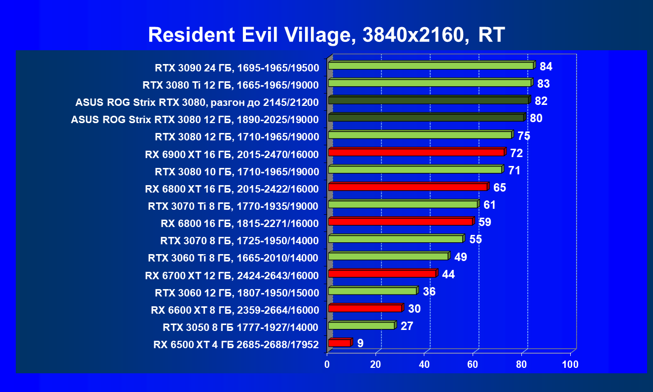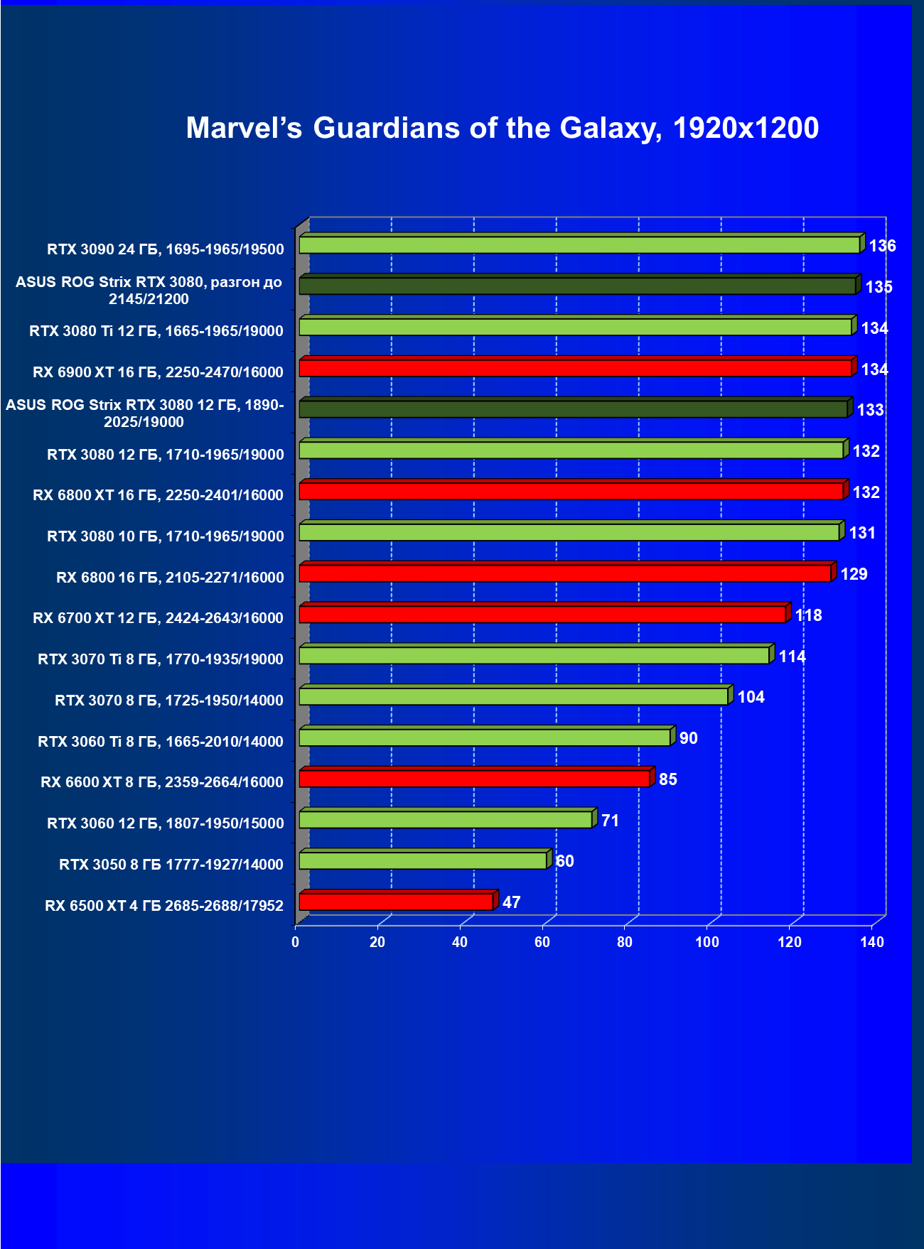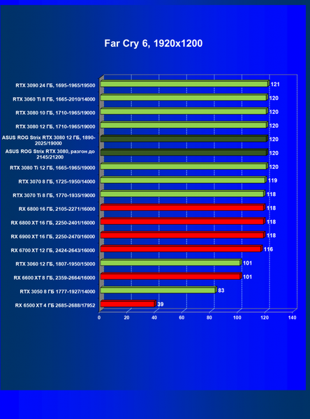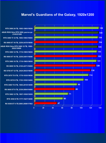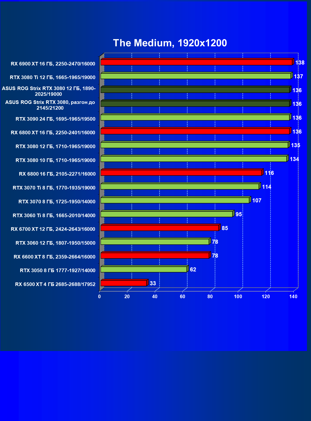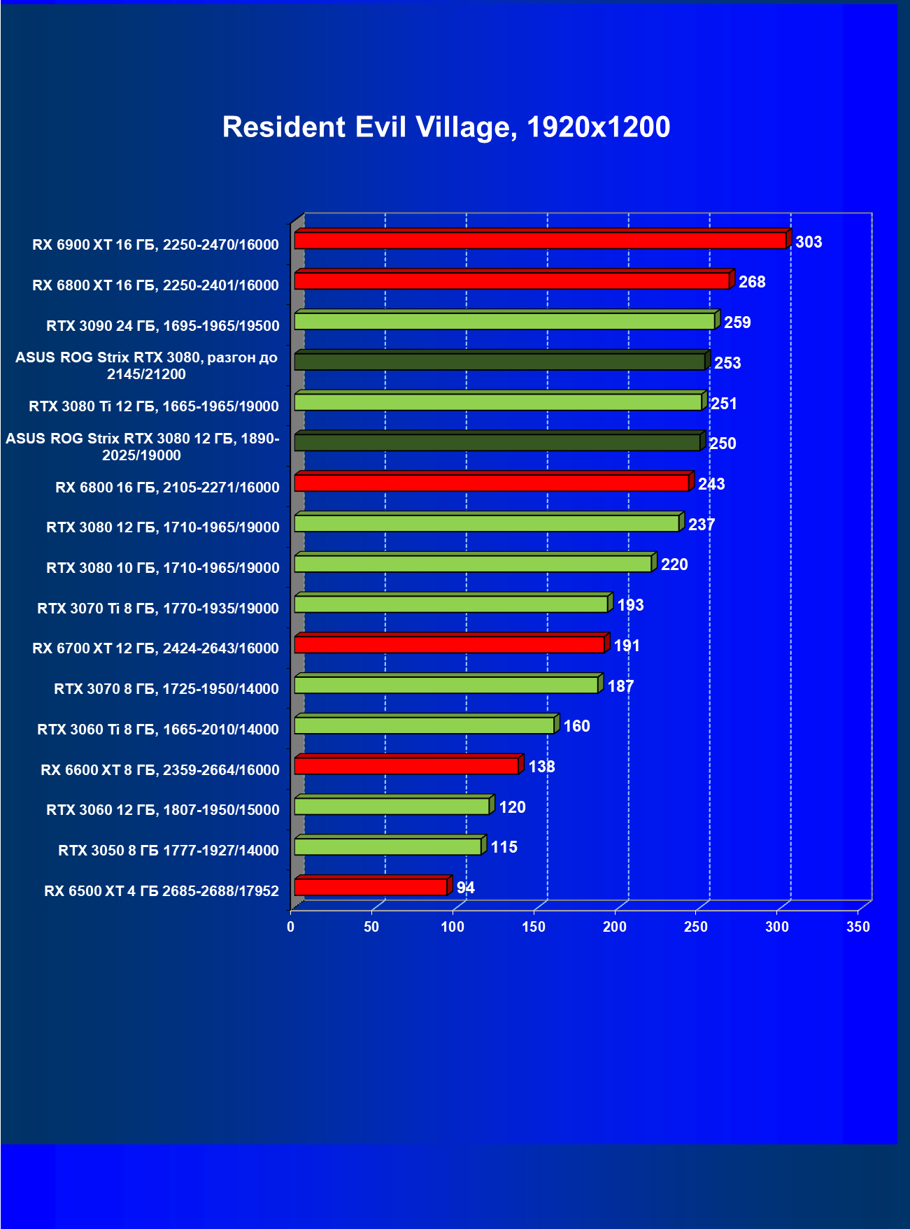 Radeon RX 6900 XT попал в нашу группу и возглавил данный рейтинг по классическим играм без трассировки лучей и дополнительных техник в виде DLSS/FSR. В таких играх RX 6800 XT опережает своего конкурента в лице RTX 3080 с 10 ГБ, и только новая версия RTX 3080 с 12 ГБ видеопамяти из-за чуть более производительного GPU и расширенной шины обмена с памятью идет с ним на равных. Ну а карта Asus из-за повышенных частот работы графического процессора обошла конкурента в лице RX 6800 XT и даже догнала RTX 3080 Ti. Разгон карты Asus почти не сказался на рейтинге, так как в Full HD эта карта и так не являлась узким местом.