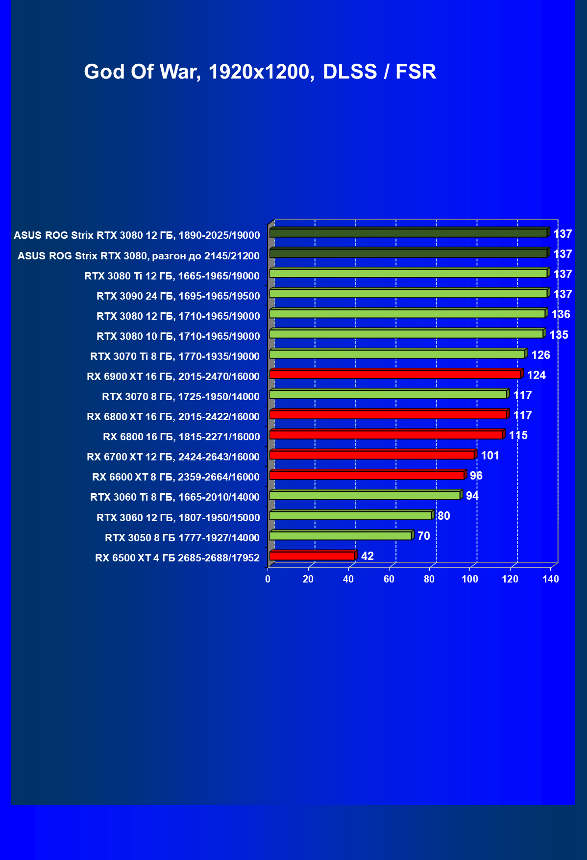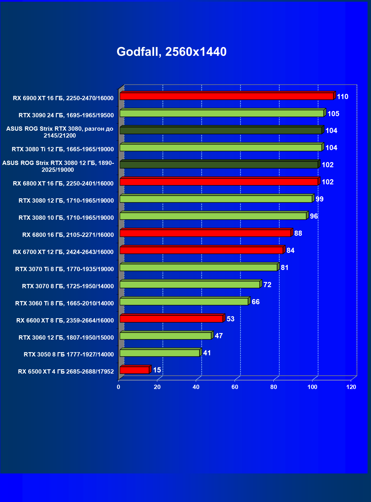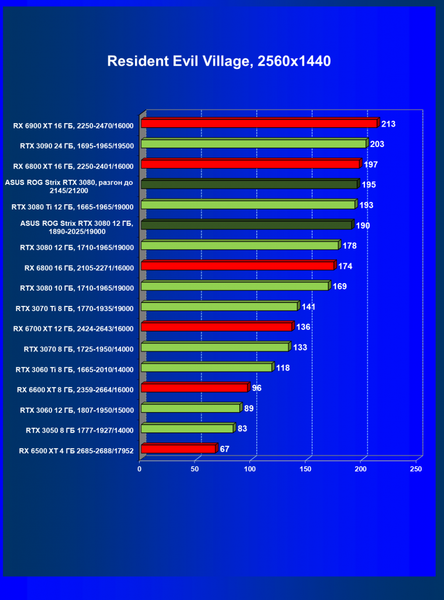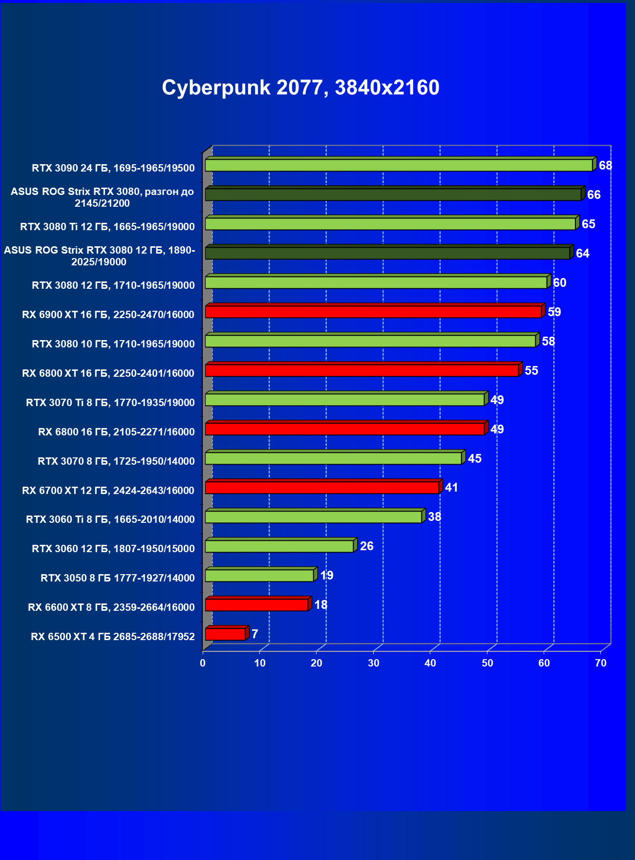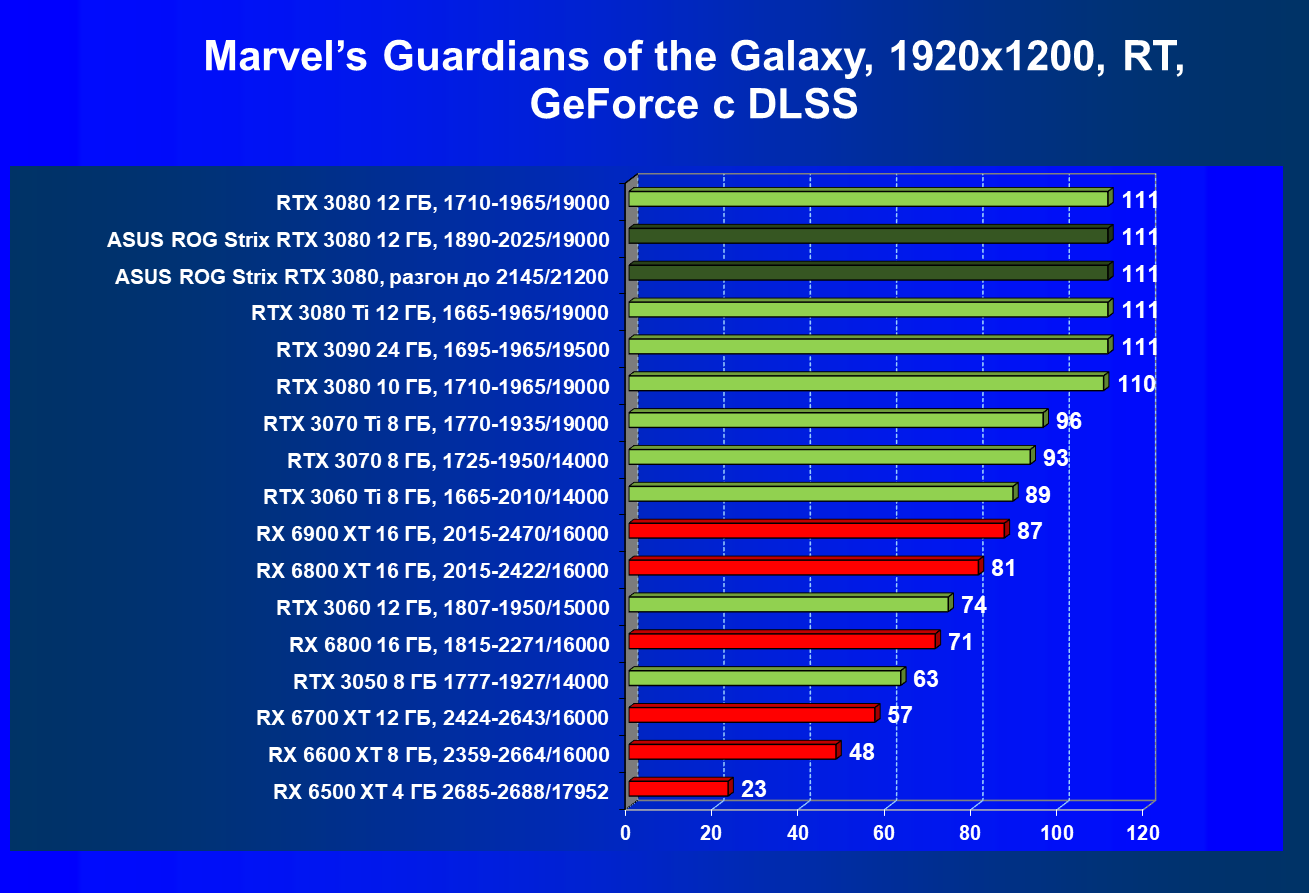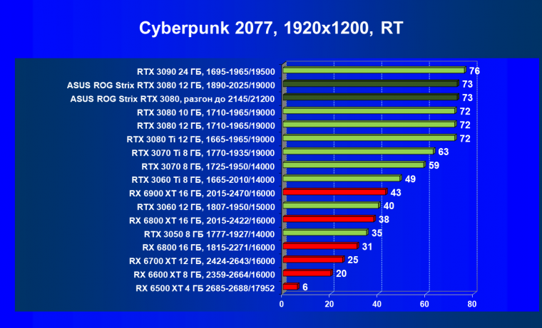 Radeon RX 6900 XT попал в нашу группу и возглавил данный рейтинг по классическим играм без трассировки лучей и дополнительных техник в виде DLSS/FSR. В таких играх RX 6800 XT опережает своего конкурента в лице RTX 3080 с 10 ГБ, и только новая версия RTX 3080 с 12 ГБ видеопамяти из-за чуть более производительного GPU и расширенной шины обмена с памятью идет с ним на равных. Ну а карта Asus из-за повышенных частот работы графического процессора обошла конкурента в лице RX 6800 XT и даже догнала RTX 3080 Ti. Разгон карты Asus почти не сказался на рейтинге, так как в Full HD эта карта и так не являлась узким местом.