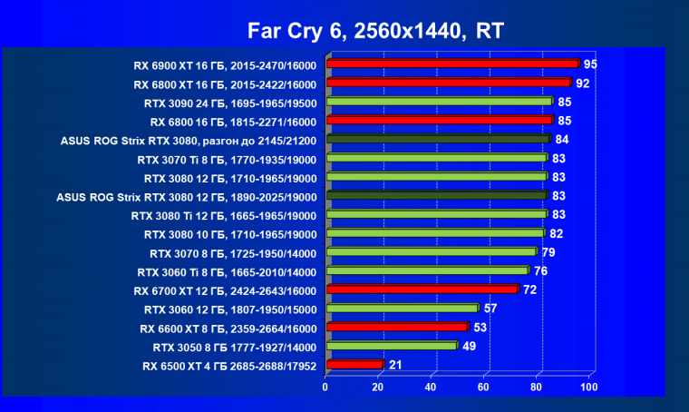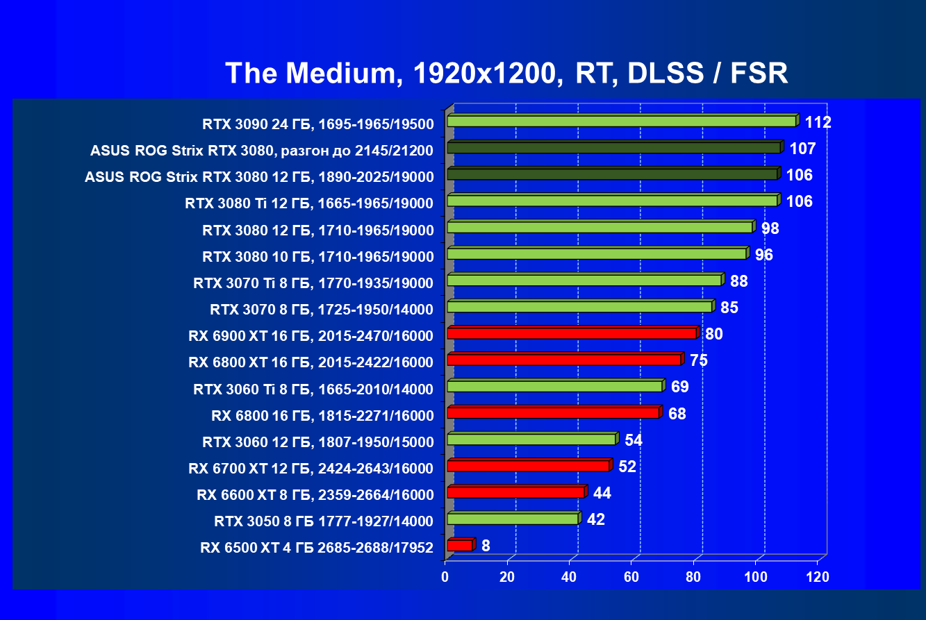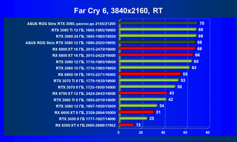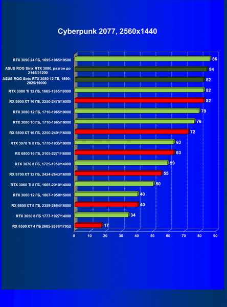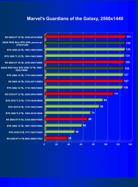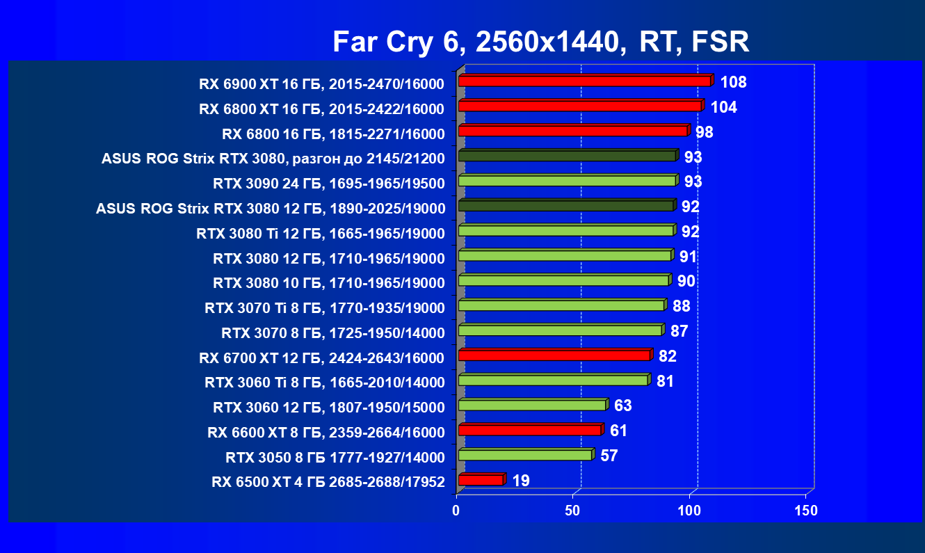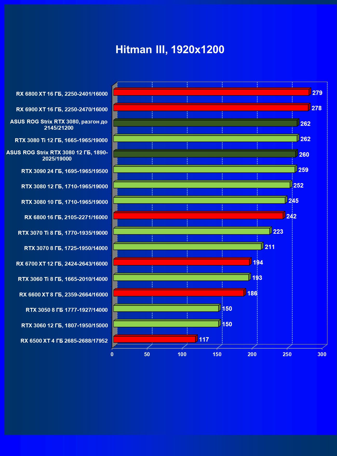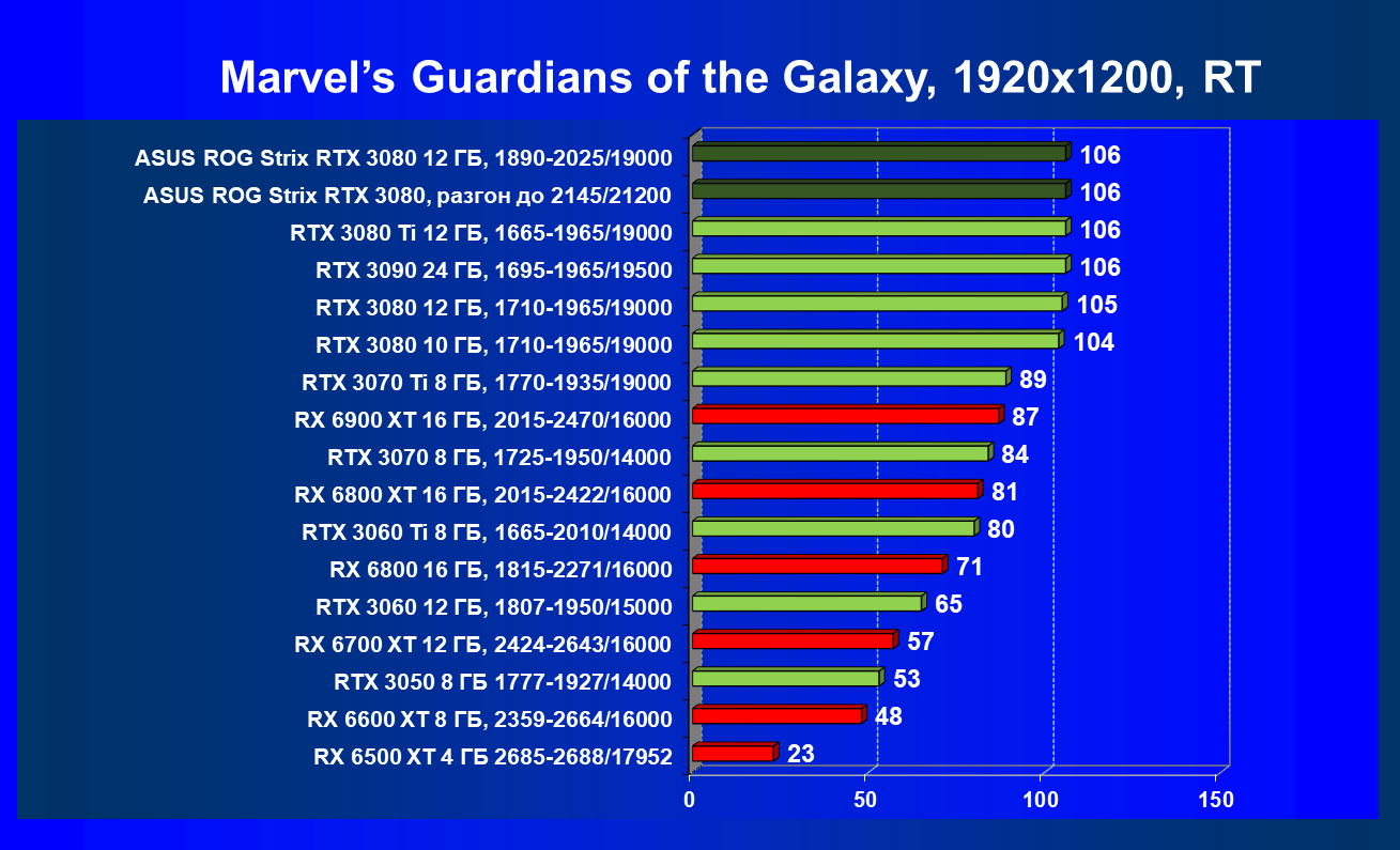 Radeon RX 6900 XT попал в нашу группу и возглавил данный рейтинг по классическим играм без трассировки лучей и дополнительных техник в виде DLSS/FSR. В таких играх RX 6800 XT опережает своего конкурента в лице RTX 3080 с 10 ГБ, и только новая версия RTX 3080 с 12 ГБ видеопамяти из-за чуть более производительного GPU и расширенной шины обмена с памятью идет с ним на равных. Ну а карта Asus из-за повышенных частот работы графического процессора обошла конкурента в лице RX 6800 XT и даже догнала RTX 3080 Ti. Разгон карты Asus почти не сказался на рейтинге, так как в Full HD эта карта и так не являлась узким местом.
