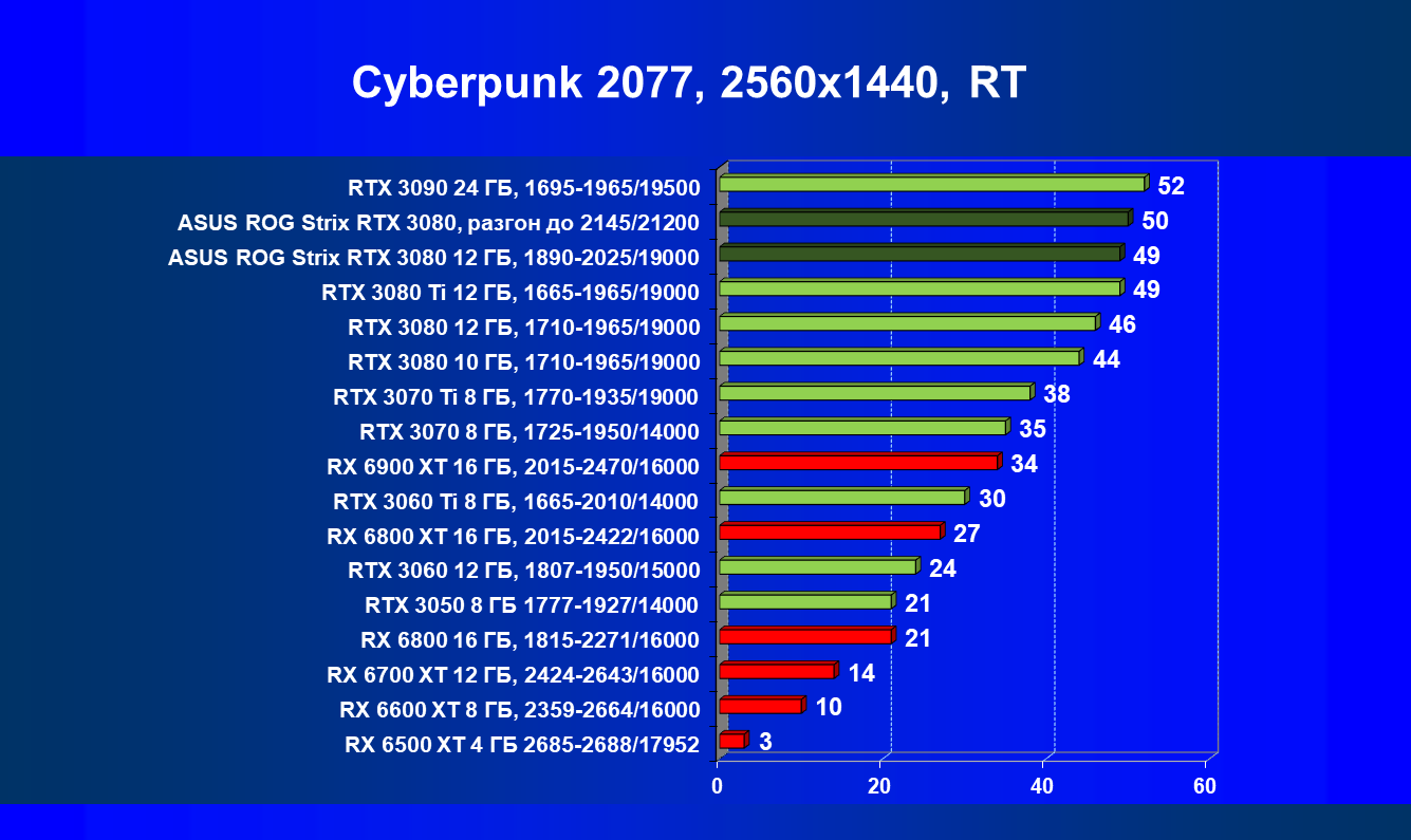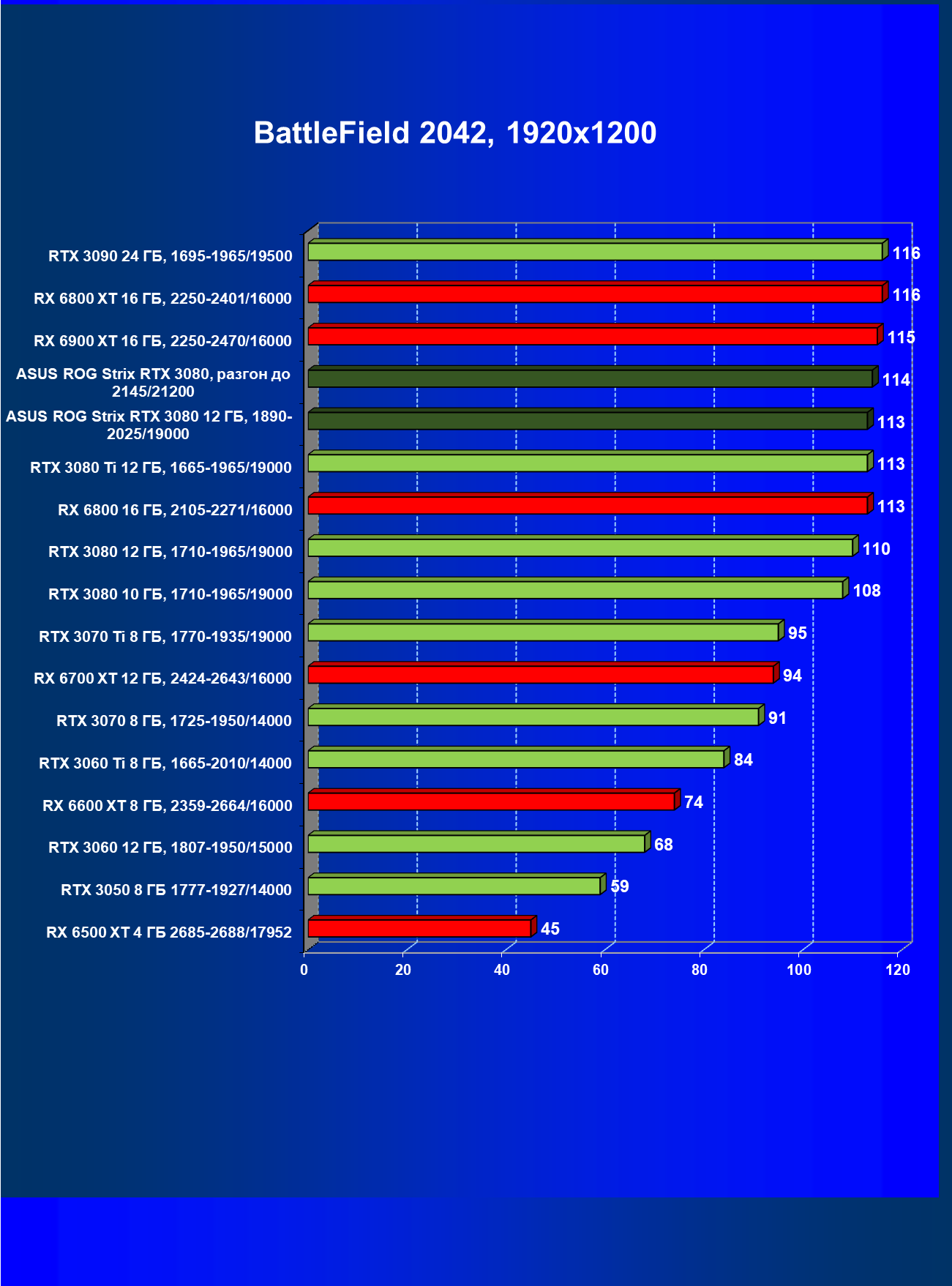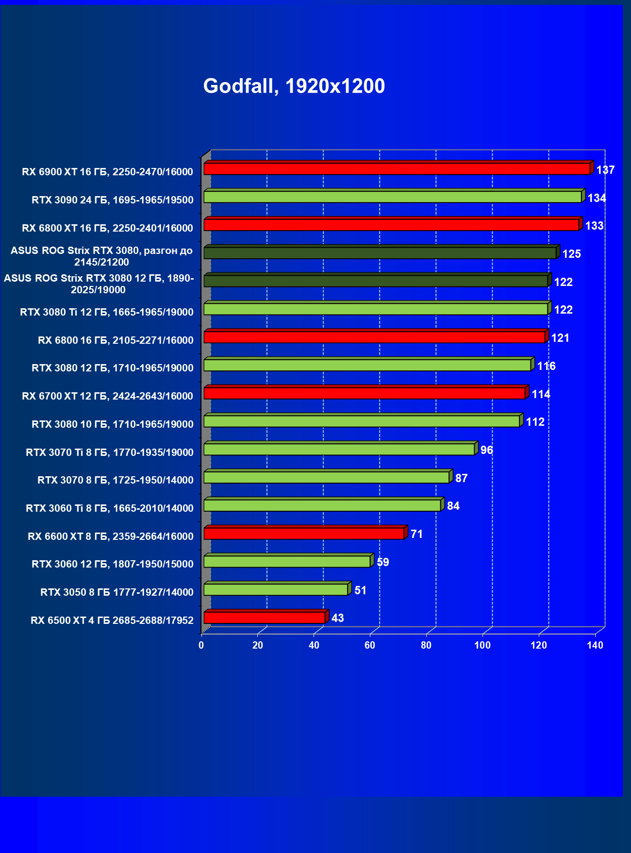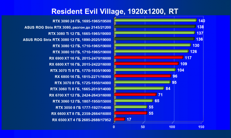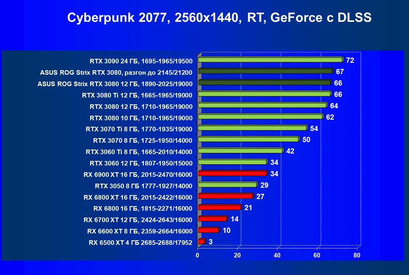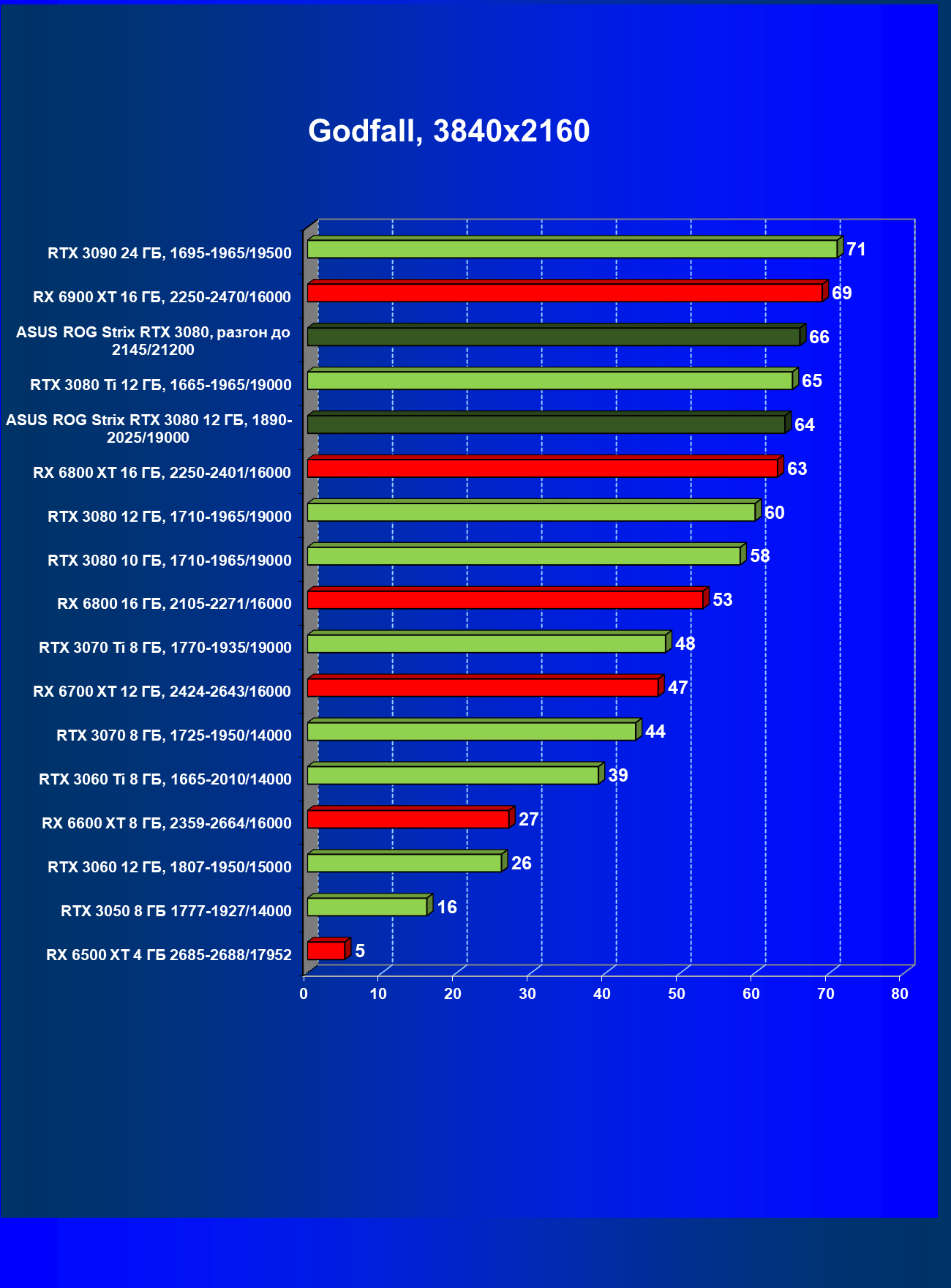 Radeon RX 6900 XT попал в нашу группу и возглавил данный рейтинг по классическим играм без трассировки лучей и дополнительных техник в виде DLSS/FSR. В таких играх RX 6800 XT опережает своего конкурента в лице RTX 3080 с 10 ГБ, и только новая версия RTX 3080 с 12 ГБ видеопамяти из-за чуть более производительного GPU и расширенной шины обмена с памятью идет с ним на равных. Ну а карта Asus из-за повышенных частот работы графического процессора обошла конкурента в лице RX 6800 XT и даже догнала RTX 3080 Ti. Разгон карты Asus почти не сказался на рейтинге, так как в Full HD эта карта и так не являлась узким местом.