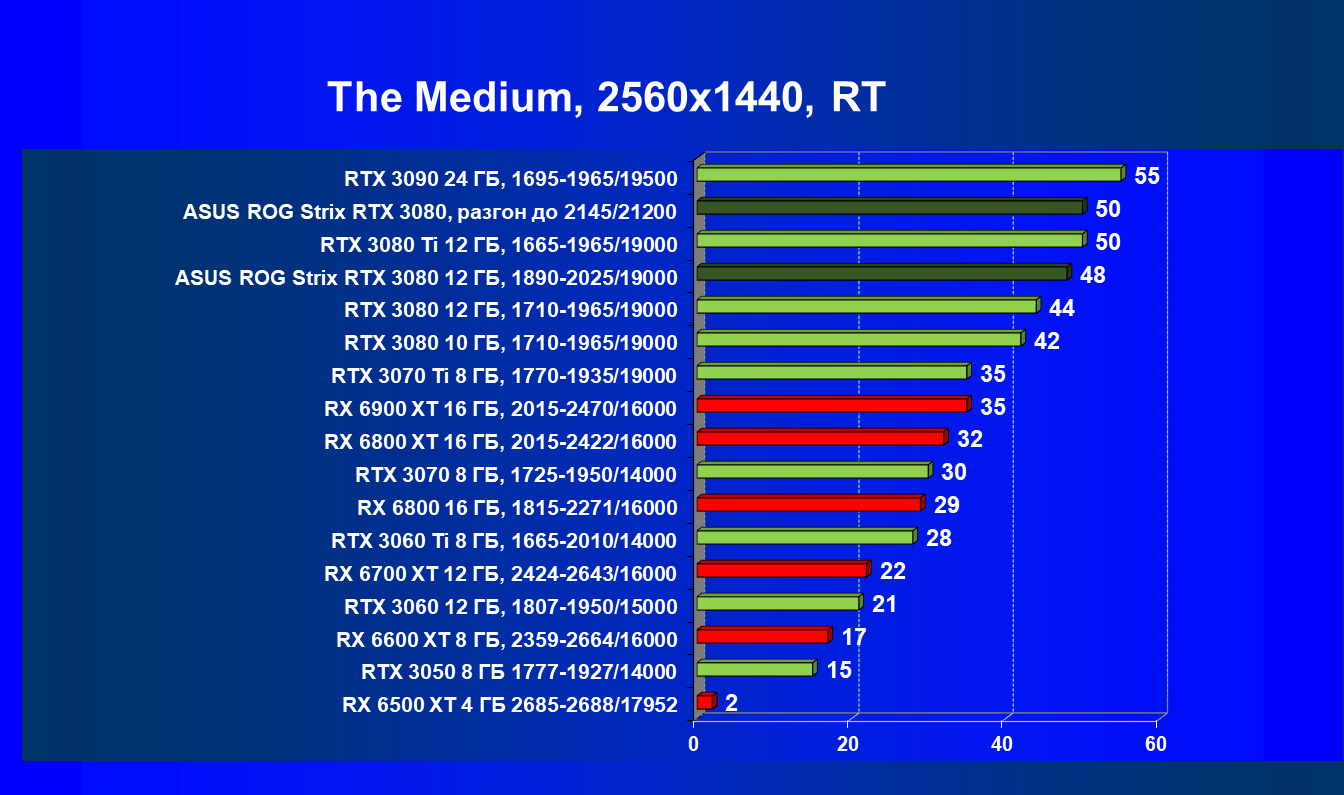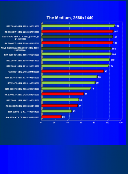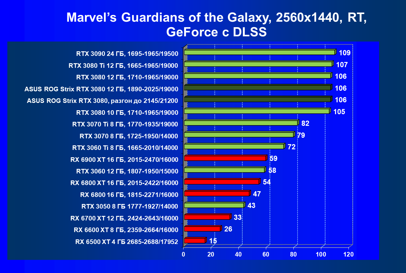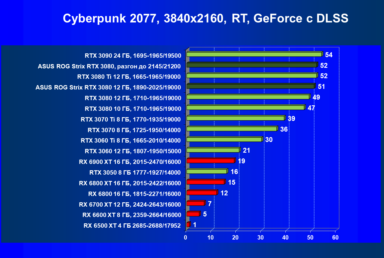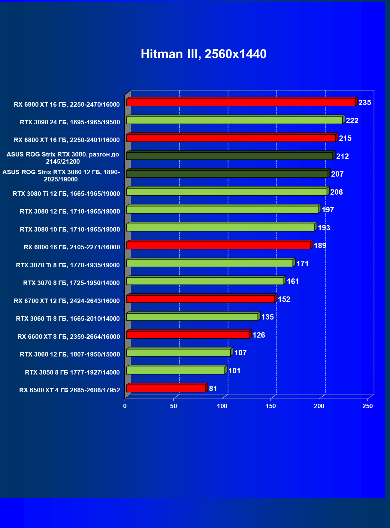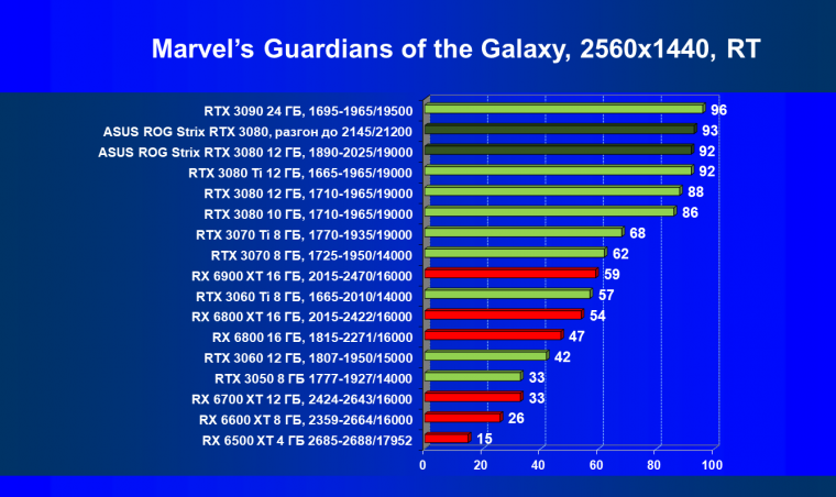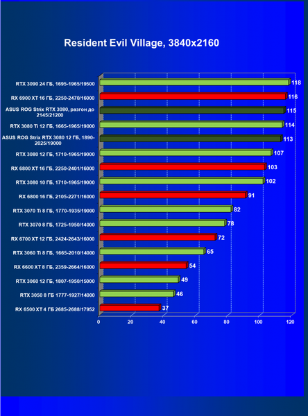 Radeon RX 6900 XT попал в нашу группу и возглавил данный рейтинг по классическим играм без трассировки лучей и дополнительных техник в виде DLSS/FSR. В таких играх RX 6800 XT опережает своего конкурента в лице RTX 3080 с 10 ГБ, и только новая версия RTX 3080 с 12 ГБ видеопамяти из-за чуть более производительного GPU и расширенной шины обмена с памятью идет с ним на равных. Ну а карта Asus из-за повышенных частот работы графического процессора обошла конкурента в лице RX 6800 XT и даже догнала RTX 3080 Ti. Разгон карты Asus почти не сказался на рейтинге, так как в Full HD эта карта и так не являлась узким местом.
