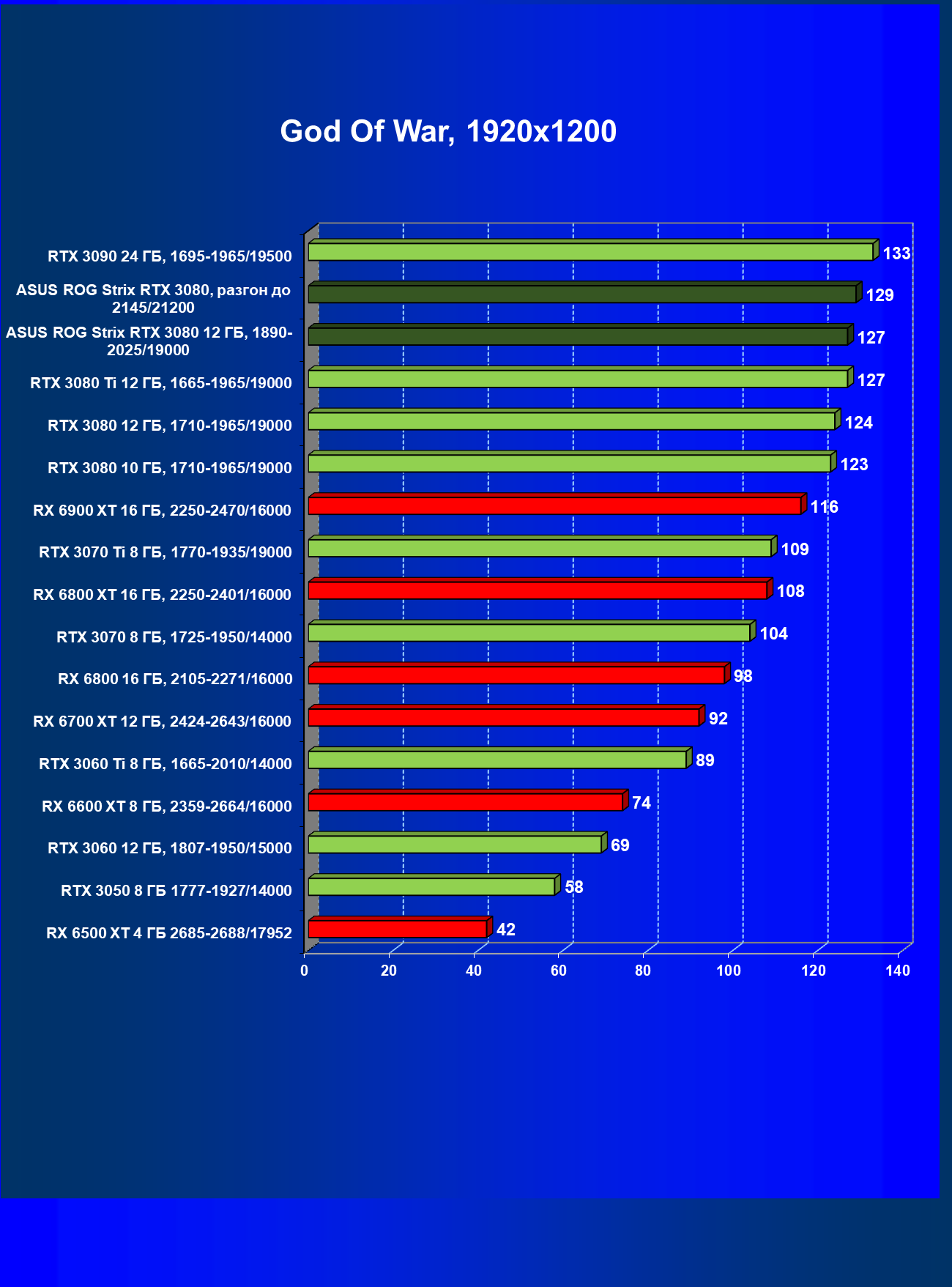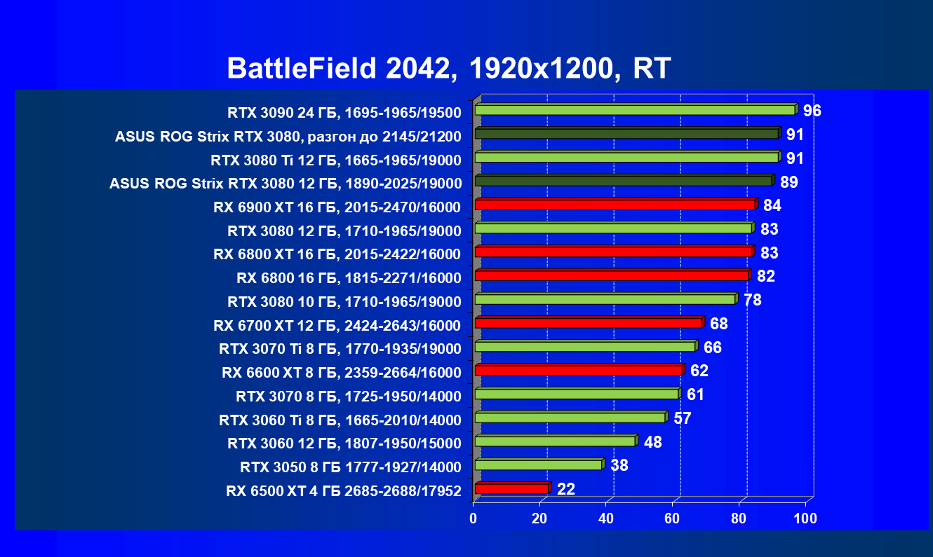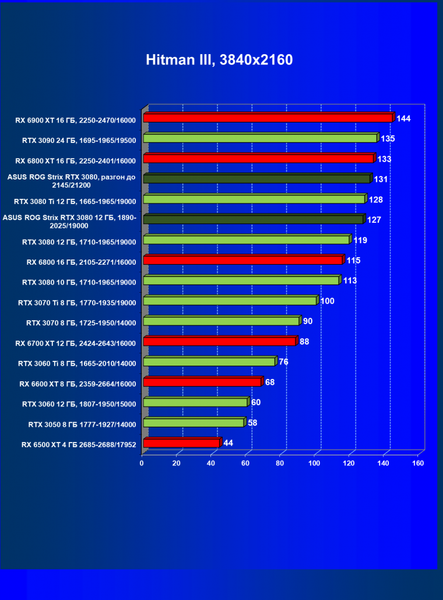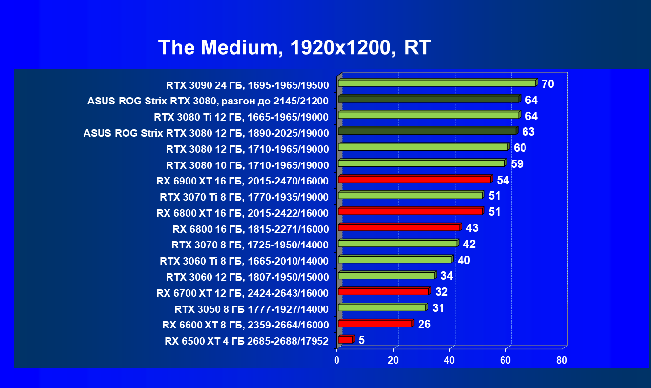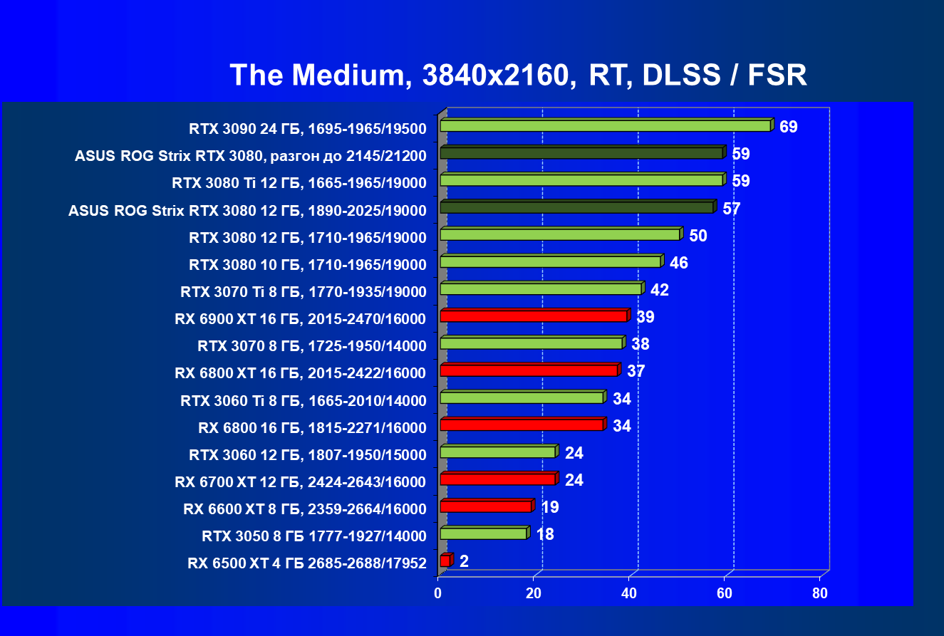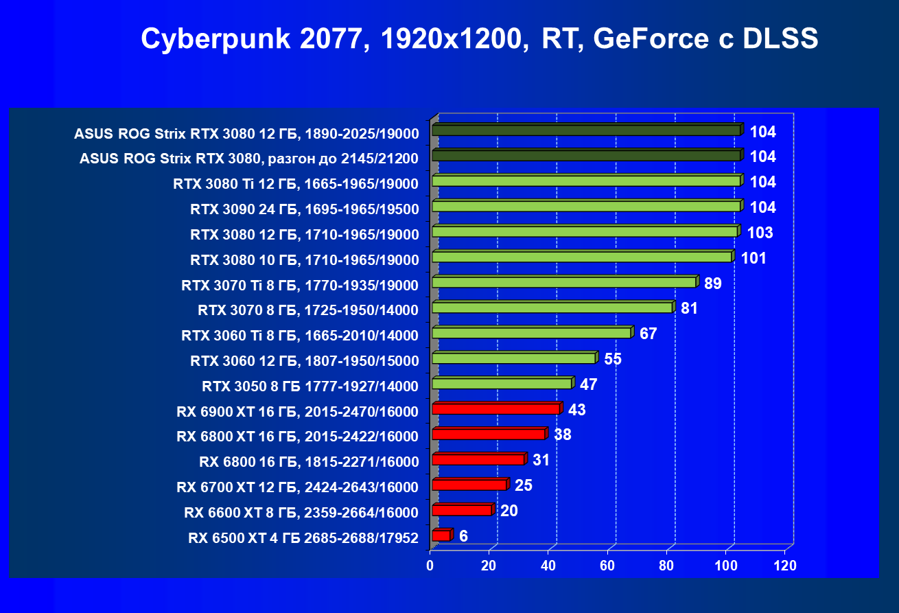 Radeon RX 6900 XT попал в нашу группу и возглавил данный рейтинг по классическим играм без трассировки лучей и дополнительных техник в виде DLSS/FSR. В таких играх RX 6800 XT опережает своего конкурента в лице RTX 3080 с 10 ГБ, и только новая версия RTX 3080 с 12 ГБ видеопамяти из-за чуть более производительного GPU и расширенной шины обмена с памятью идет с ним на равных. Ну а карта Asus из-за повышенных частот работы графического процессора обошла конкурента в лице RX 6800 XT и даже догнала RTX 3080 Ti. Разгон карты Asus почти не сказался на рейтинге, так как в Full HD эта карта и так не являлась узким местом.