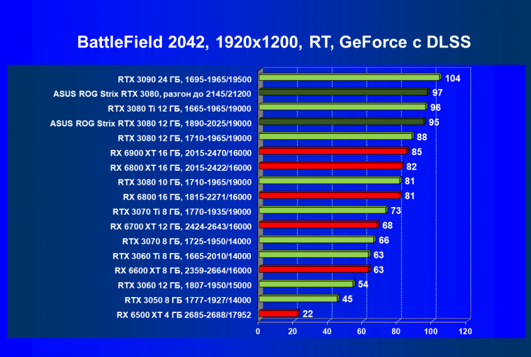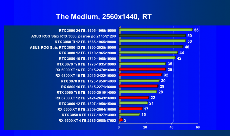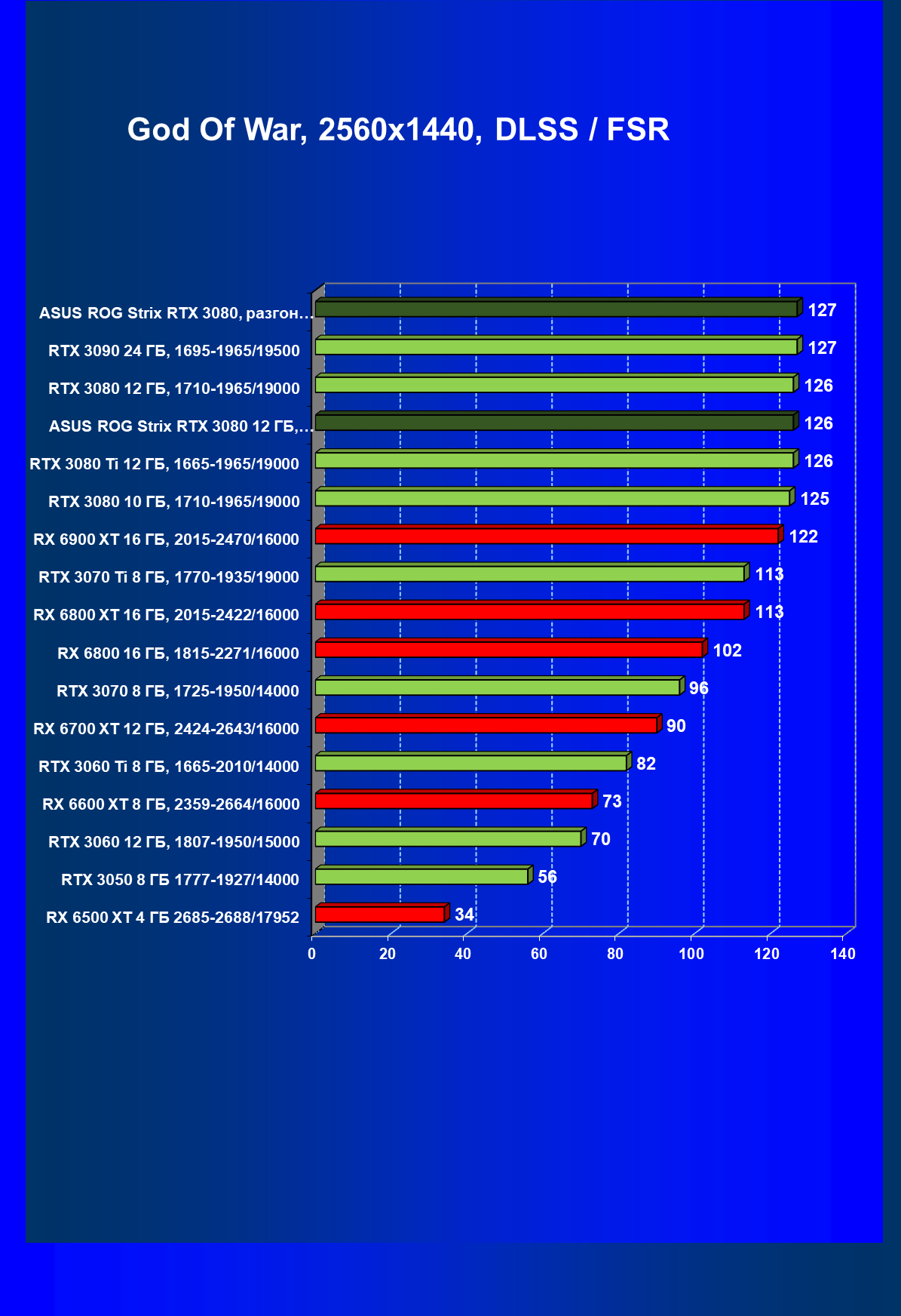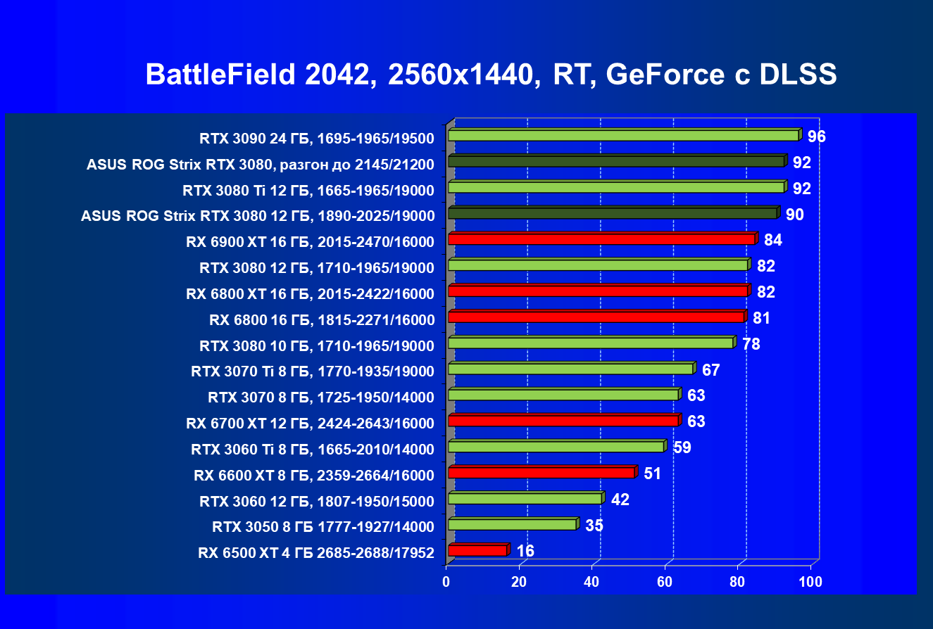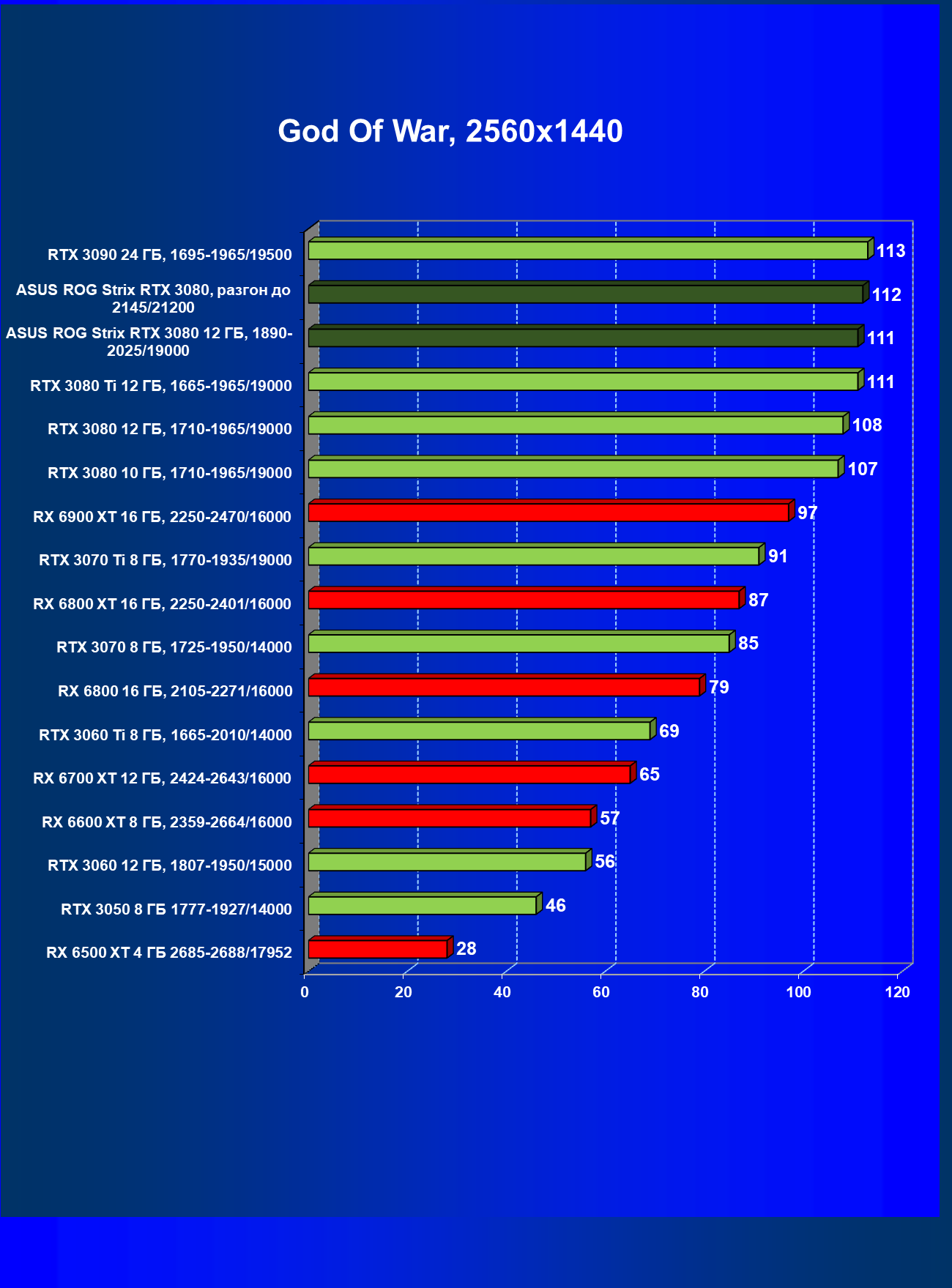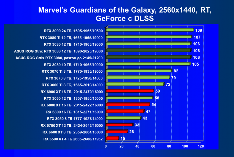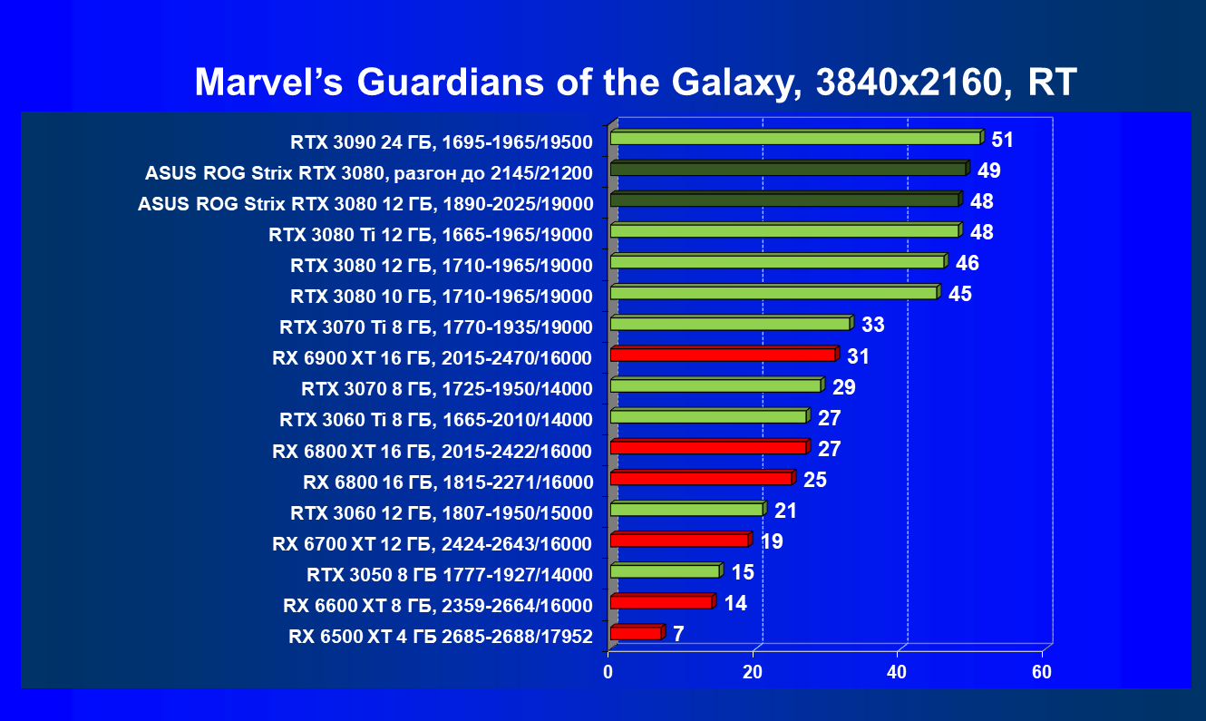 Radeon RX 6900 XT попал в нашу группу и возглавил данный рейтинг по классическим играм без трассировки лучей и дополнительных техник в виде DLSS/FSR. В таких играх RX 6800 XT опережает своего конкурента в лице RTX 3080 с 10 ГБ, и только новая версия RTX 3080 с 12 ГБ видеопамяти из-за чуть более производительного GPU и расширенной шины обмена с памятью идет с ним на равных. Ну а карта Asus из-за повышенных частот работы графического процессора обошла конкурента в лице RX 6800 XT и даже догнала RTX 3080 Ti. Разгон карты Asus почти не сказался на рейтинге, так как в Full HD эта карта и так не являлась узким местом.
