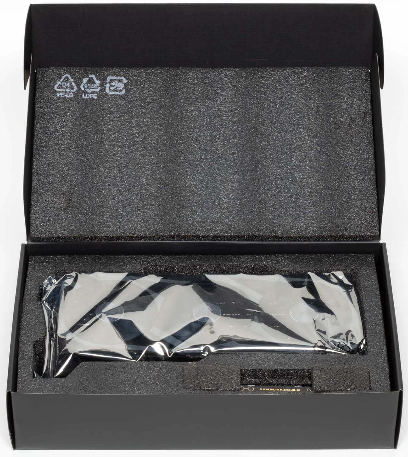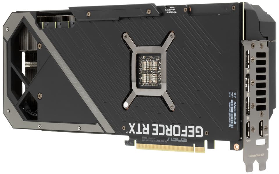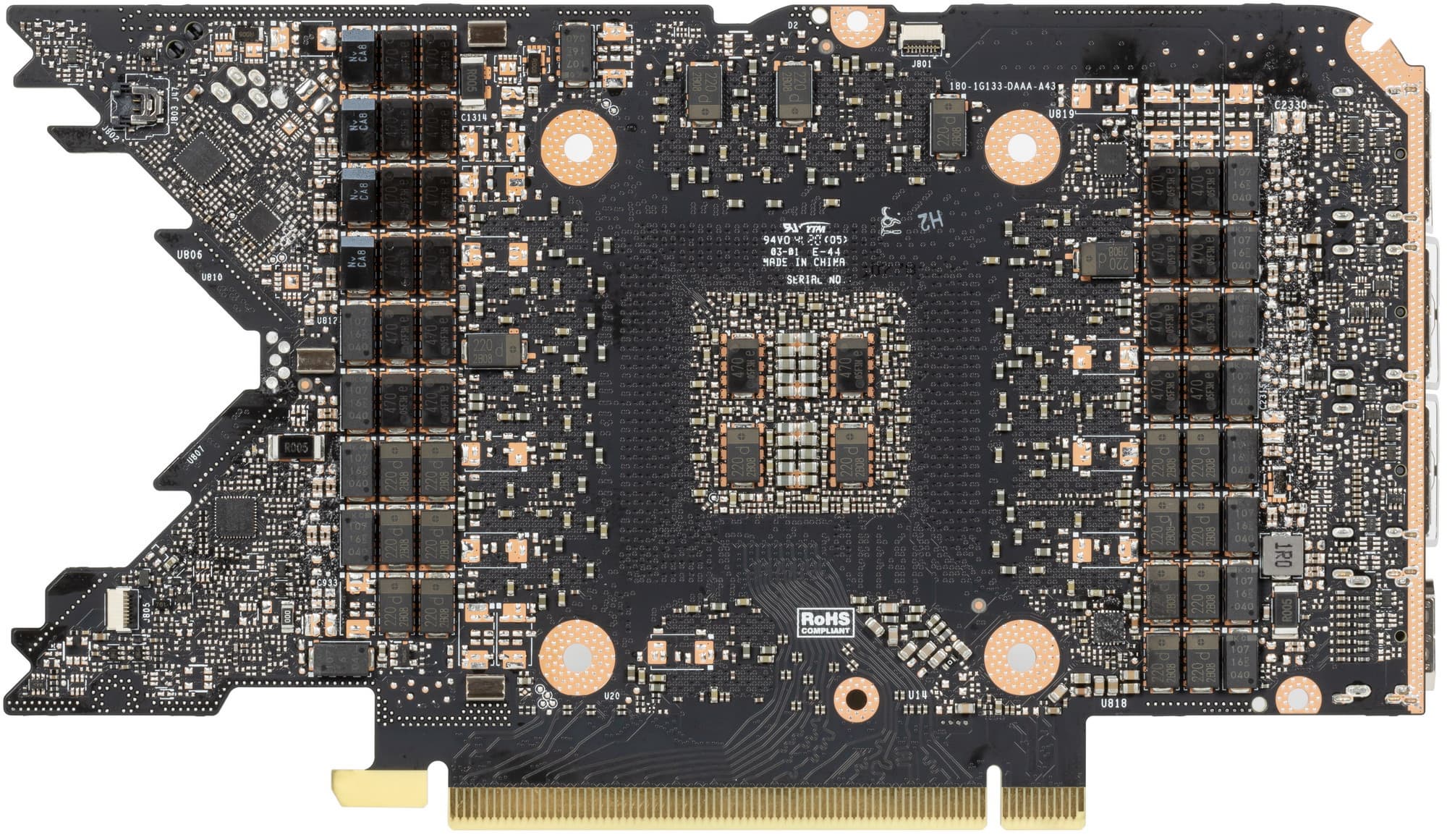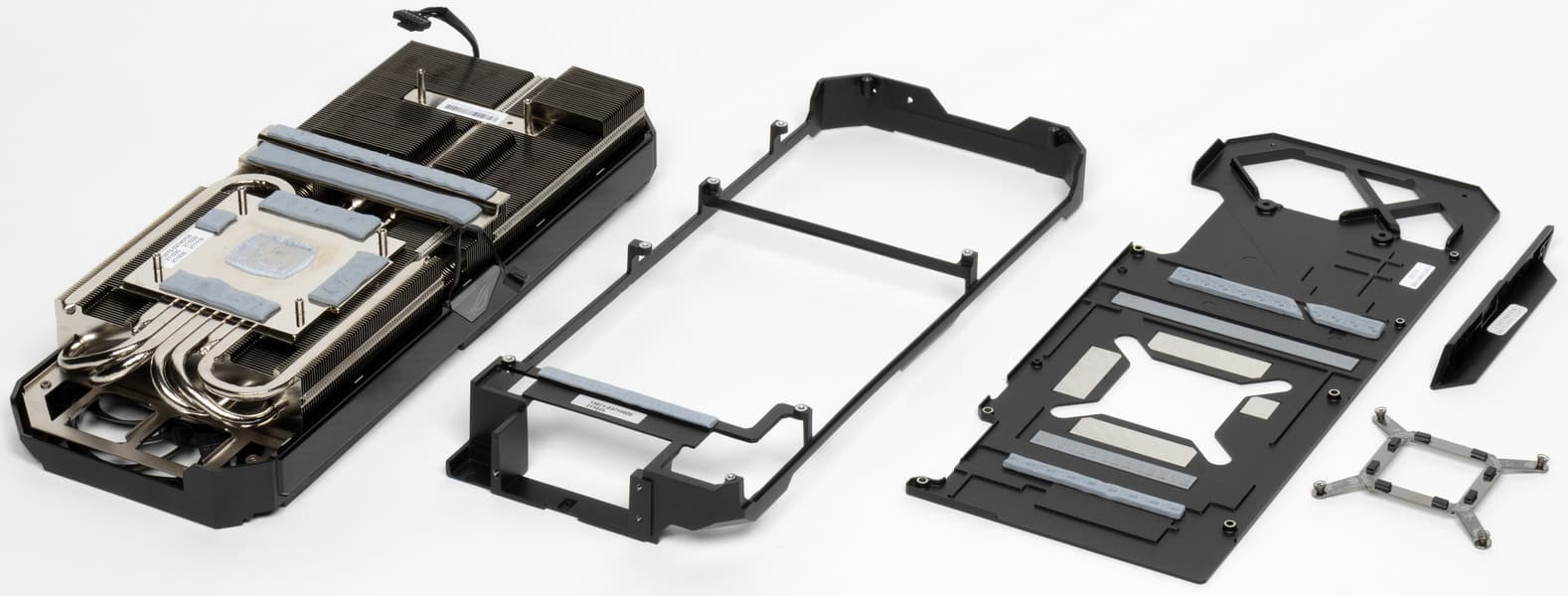 Основой СО является огромный двухсекционный пластинчатый никелированный радиатор с тепловыми трубками, припаянными к подошве прямого контакта с GPU и микросхемами памяти. Этот же радиатор служит охладителем и для компонентов преобразователей питания VRM с помощью небольших подошв. Для остальных мосфетов VRM предусмотрен отдельный радиатор, размещенный на раме, прикрученной к основному радиатору. Задняя пластина выполнена из алюминия с электроизолирующим покрытием и имеет двойное предназначение: служит элементом защиты PCB и через термоинтерфейс участвует в охлаждении оборотной стороны карты в зонах преобразователей питания.