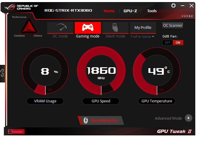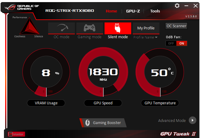 В простое режимы Performance Mode и Quiet Mode совершенно не отличались: в 2D температура была не выше 44 °C, вентиляторы не работали, уровень шума был равен фоновому — 18 дБА.