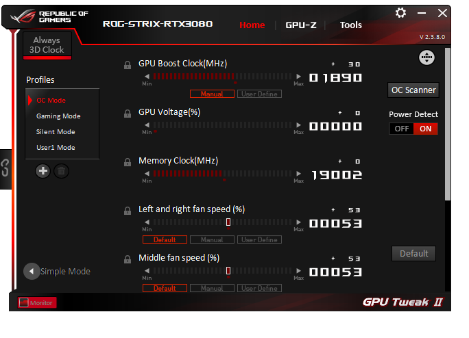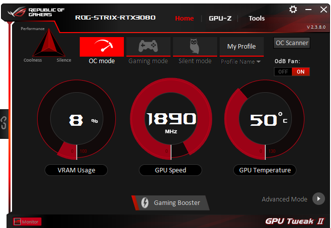 Через фирменную утилиту Asus GPU Tweak II можно включить фабричный режим OC Mode. Разумеется, есть и возможность ручного разгона.
