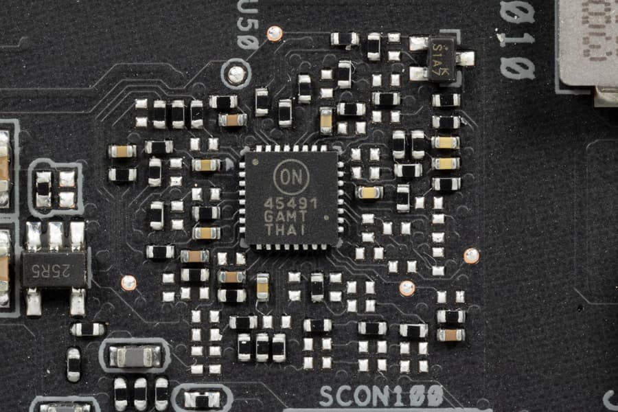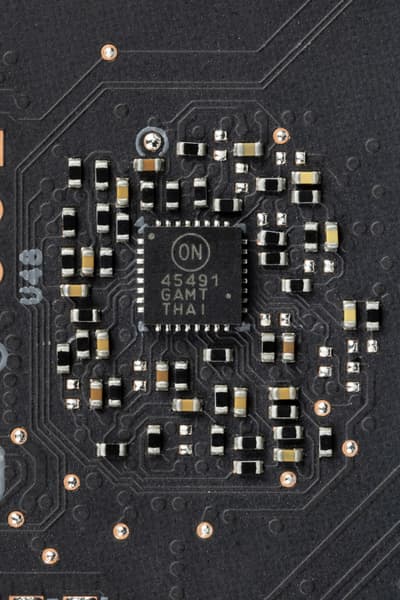 Также есть два контроллера NCP45491 (On Semiconductor), отвечающие за мониторинг (слежение за напряжением и температурой). Они расположены на лицевой и оборотной сторонах PCB.