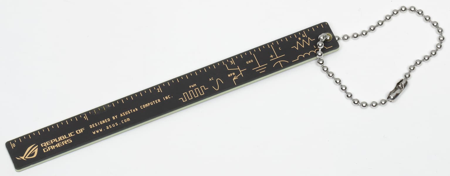 Комплект поставки, кроме традиционного руководства пользователя и карточки ROG, включает мелкие бонусы в виде стяжек и фирменной линейки.