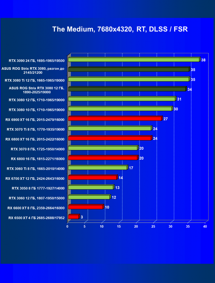 Результаты тестов с включенной аппаратной трассировкой лучей (и DLSS / FSR) в разрешении 7680×4320 (8К)
