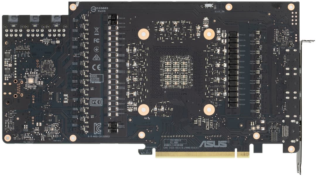 Карта имеет двойной BIOS, что уже традиционно для топовых решений Asus. На торце карты есть переключатель, в разных версиях BIOS (они названы Performance mode и Quiet mode — производительный и тихий режимы) заданы разные кривые работы вентиляторов.