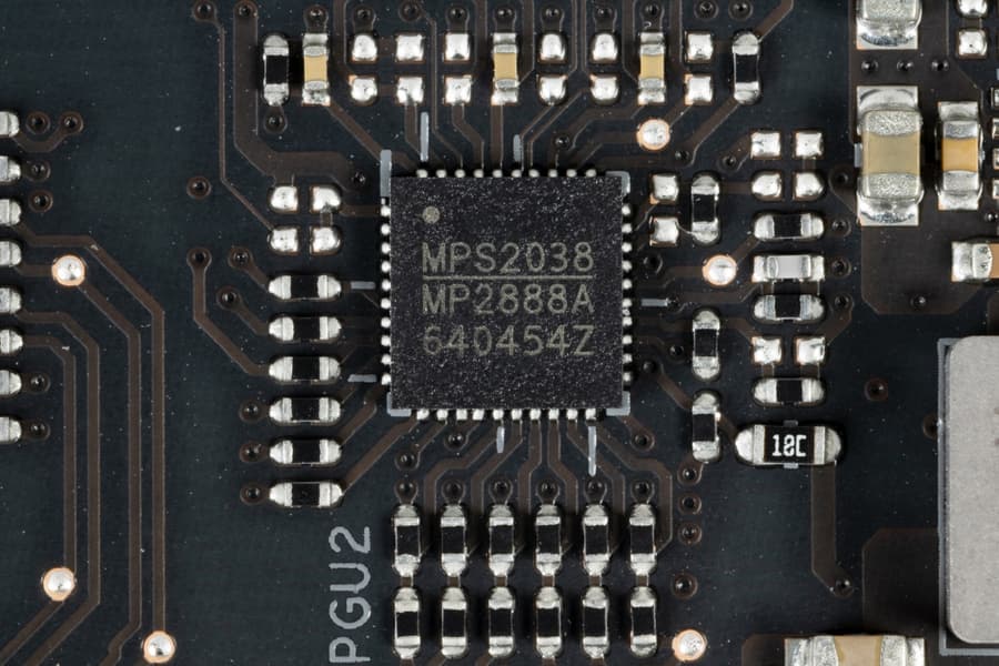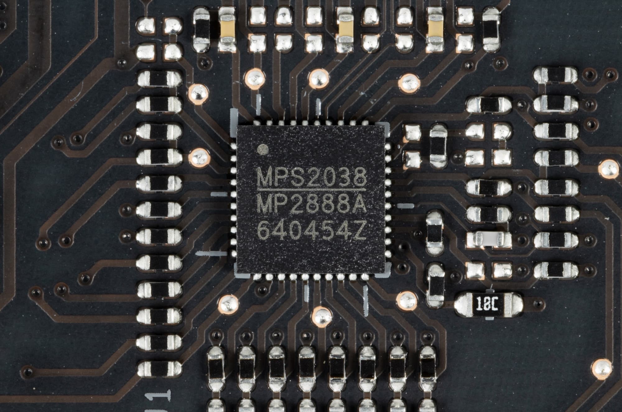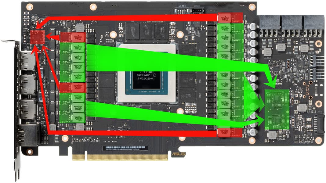 Зеленым цветом отмечена схема питания ядра, красным — памяти. Для управления схемой питания GPU используются два ШИМ-контроллера MP2888A (Monolith Power Systems), каждый из которых способен управлять максимум 10 фазами (реализовано 9+9). Оба расположены на лицевой стороне платы.