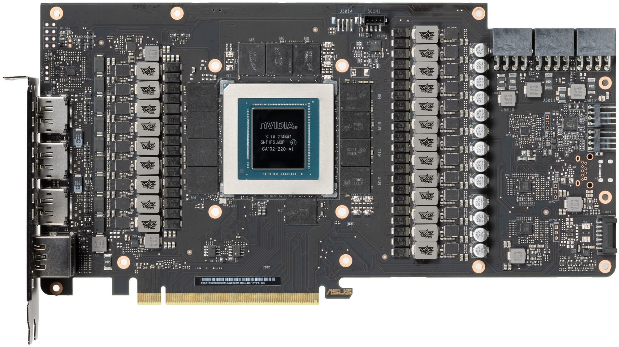 Карта Asus получилась более габаритной, нежели RTX 3080 Ti FE, однако это определяется ее весьма громоздкой СО. Суммарное количество фаз питания у референс-карты — 18, а у карты Asus — 22. Распределение фаз: 18 на ядро и 4 на микросхемы памяти у карты Asus и 15+3 у референса.