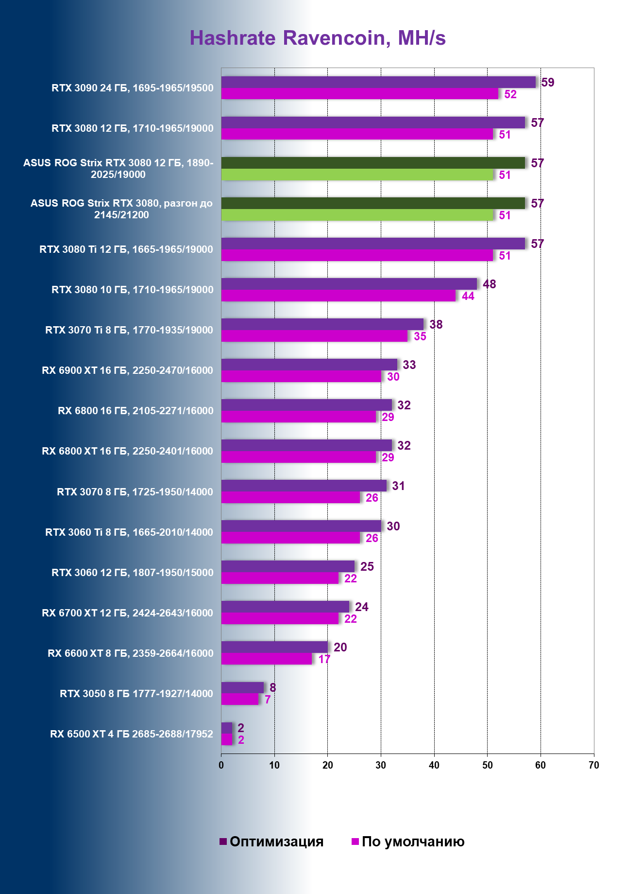 В нашем случае после оптимизации параметров работы карты и принудительного улучшения охлаждения нагрев памяти при майнинге по алгоритму ethash не превышал 71 градуса. А хэшрейт вырос почти до 62 MH/s, что сравнимо уже с RT 6900 XT и RTX 3070 без LHR, у которого память чрезмерно разогнана.