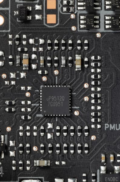 На той же стороне имеется ШИМ-контроллер uPI Semiconductor uP9512Q, который управляет 4-фазной схемой питания микросхем памяти.