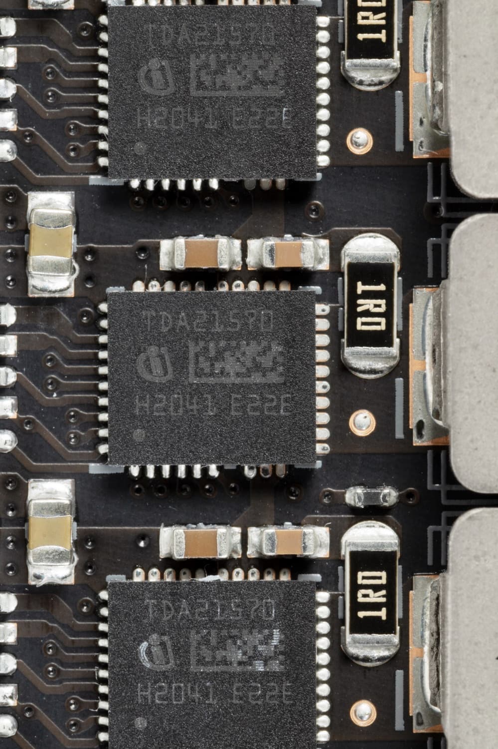 Схема питания ядра у карты Asus традиционно построена с применением технологии Super Alloy Power II, использованы современные твердотельные конденсаторы и транзисторные сборки DrMOS — в данном случае TDA21570 (Infineon), каждая из которых рассчитана максимально на 70 А.